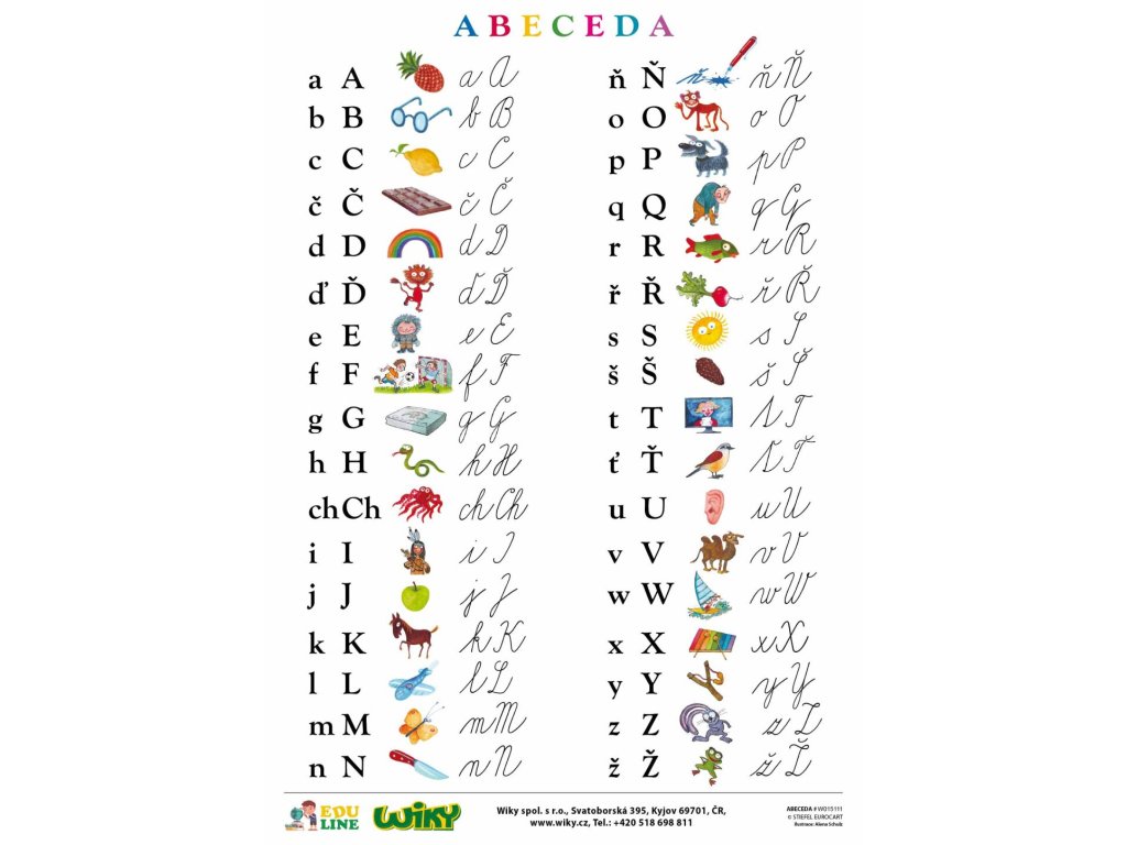 Barevná abeceda A4 pro prvňáčky s velkými a malými písmeny, psacím a tiskacím písmem a ilustracemi – ideální pro čtení a psaní doma i ve škole.