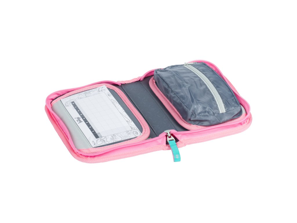 • Uvnitř aktovky je průhledná kapsa na rozvhr a vnitřní organizér umožňující rovnoměrné rozložení hmotnosti, doplněný gumičkou pro fixaci.