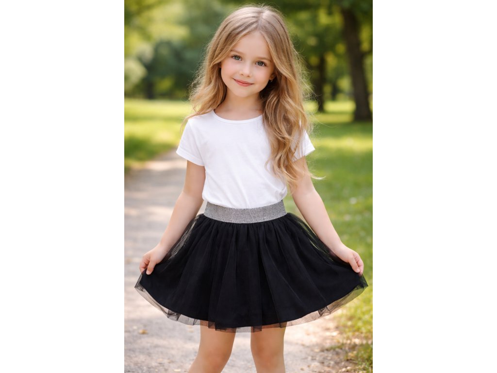 Dvouvrstvá dívčí sukně s tylovou vrchní vrstvou a bavlněnou spodní vrstvou, stříbrný pas dodává elegantní vzhled. Vhodná na karneval, slavnostní události i běžné nošení.