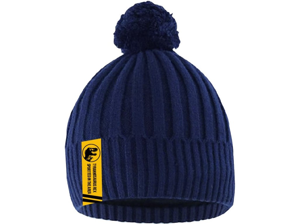 Dětská zimní čepice Jurský svět je lehce pletená, ideální na podzim i zimu. Vyrobena z velmi pružného úpletu, doplněna bambulí a žlutou nášivkou s motivem tyranosaura. Materiál je měkký, příjemný na dotek a šetrný k dětské pokožce.