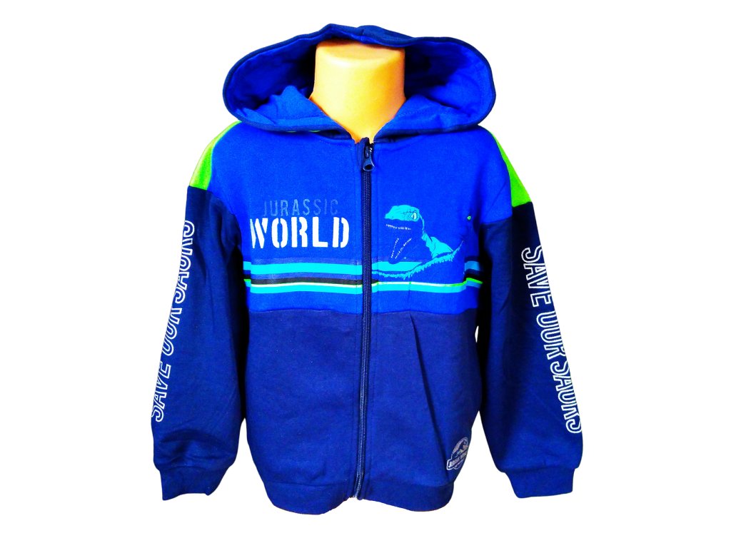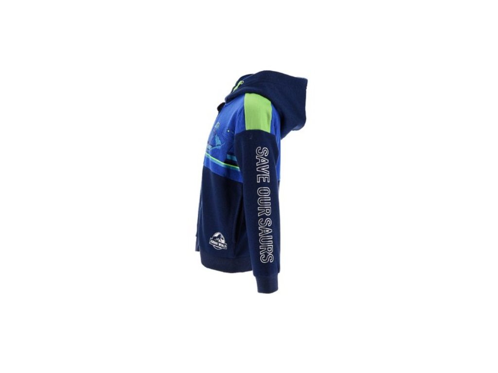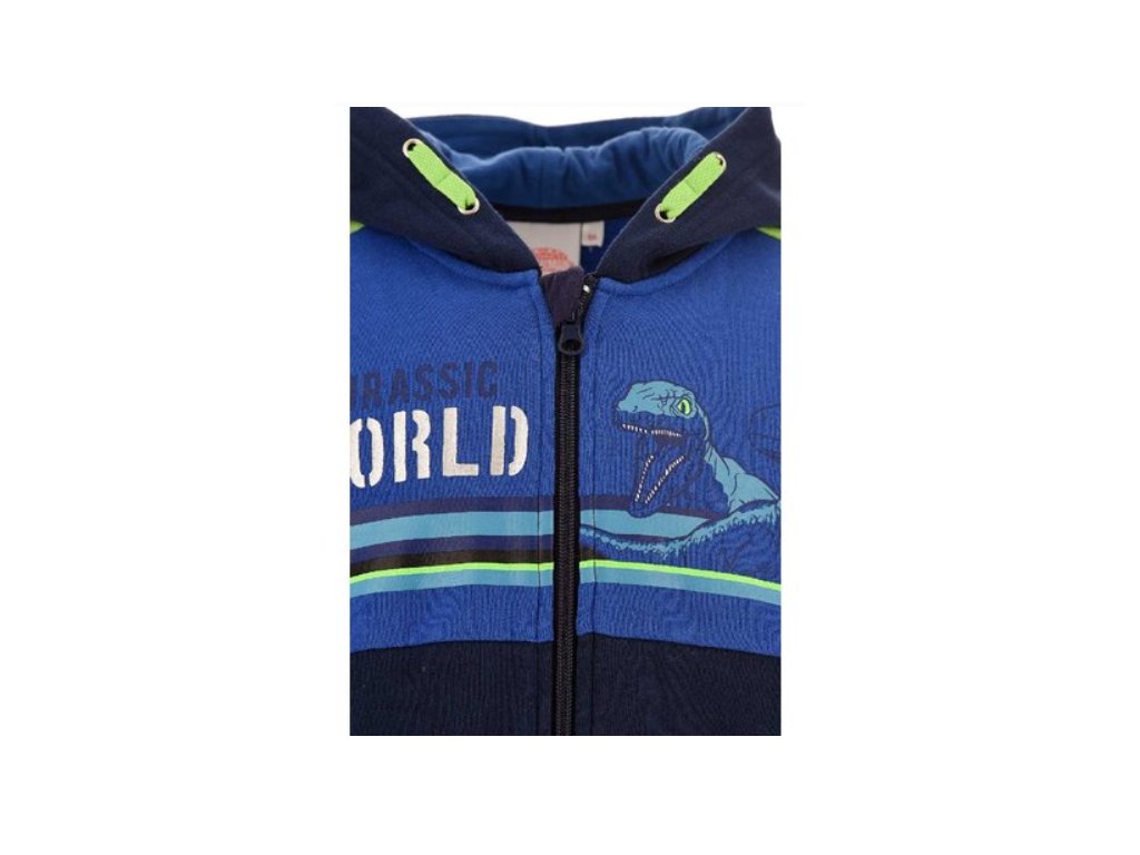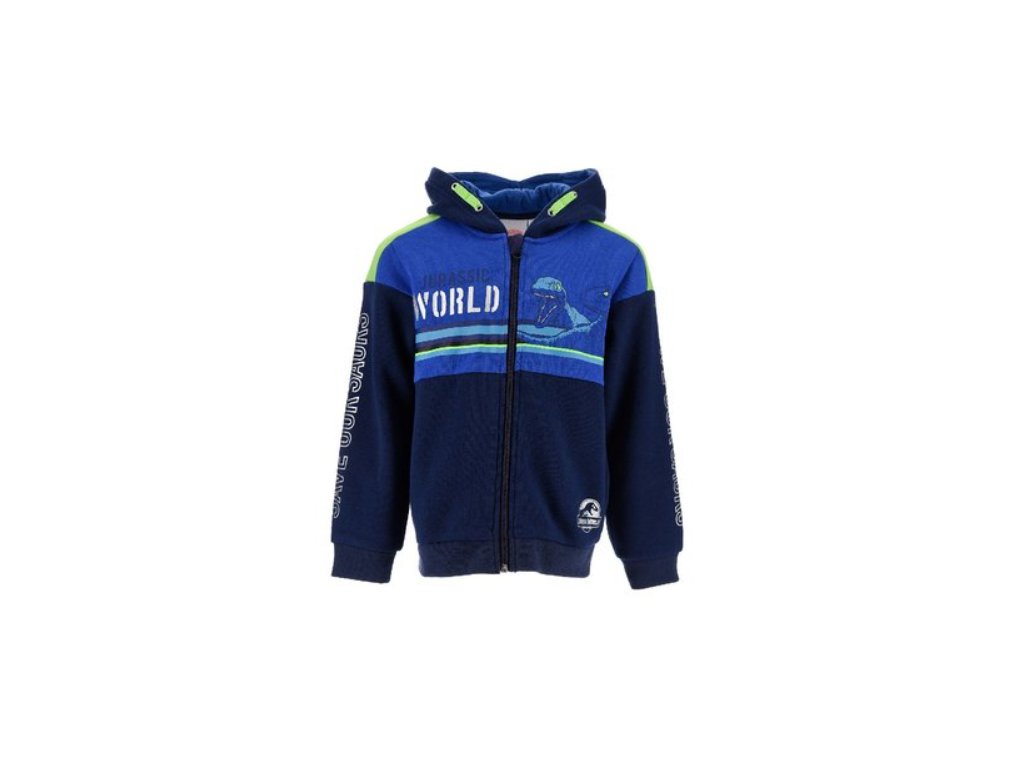 Chlapecká mikina Jurský svět pro malé dobrodruhy s motivem dinosaurů je hřejivá a pohodlná. Modrá mikina s kapucí je ideální na sport i běžné nošení. Pružné manžety a zip s ochranou u krku zajišťují maximální komfort po celý den.
