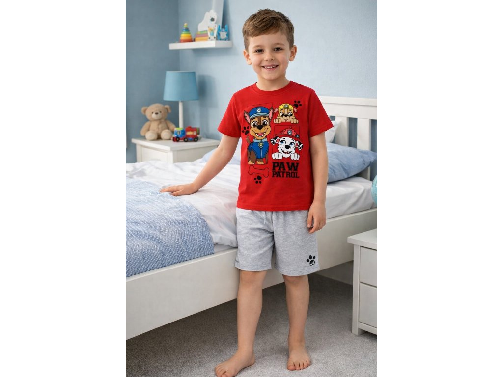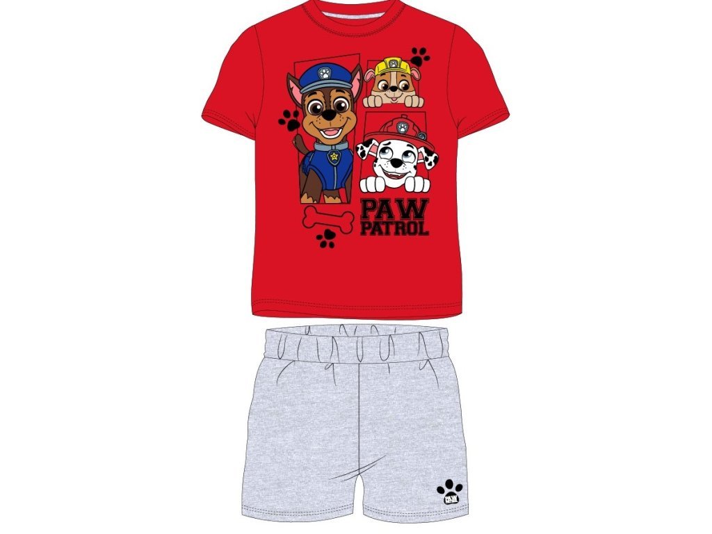 Chlapecké pyžamo Paw Patrol s Chasem, Marshallem a Rubblem zpříjemní večerní čas a usínání malých dobrodruhů. Pyžamo je vyrobeno z kvalitní bavlny, která je příjemná na dotek, a šortky mají v pase výborně pružnou gumu pro pohodlné nošení. Jako bonus je na nohavici roztomilý otisk psí tlapky. Štěňata z Tlapkové patroly jsou ideální parťáci pro děti plné energie a fantazie.