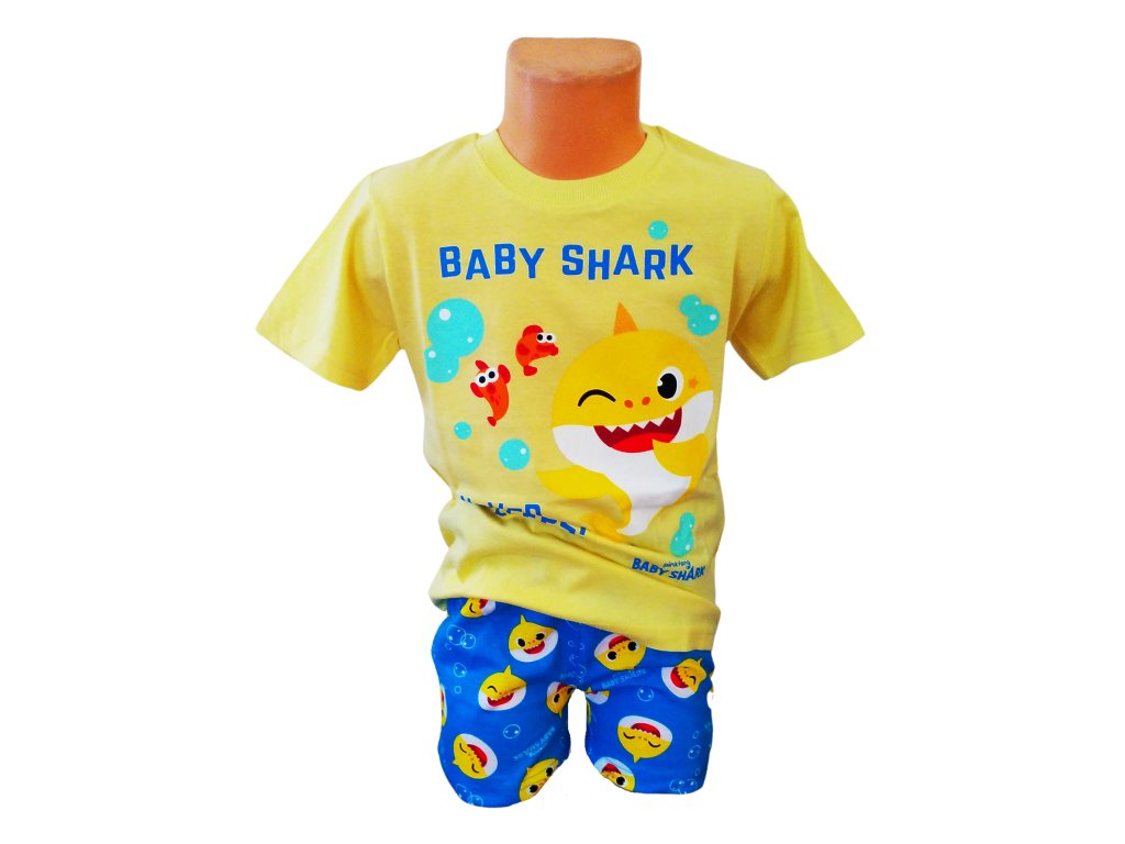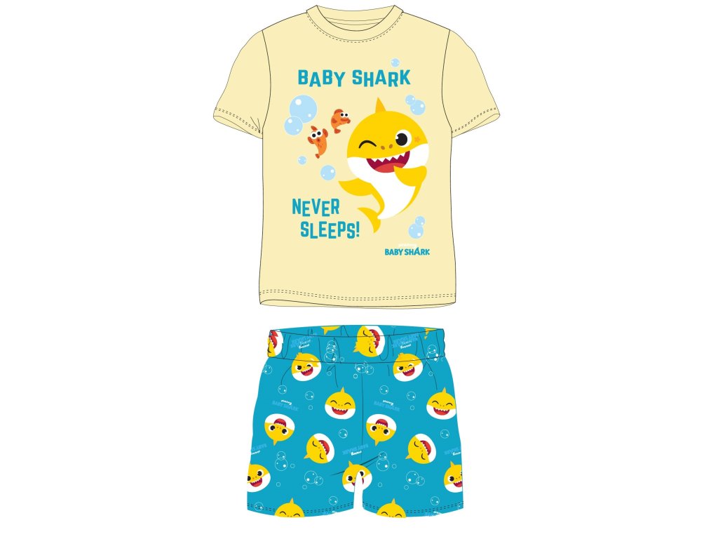 Bavlněné dětské pyžamo Baby Shark – letní krátké provedení potěší všechny malé fanoušky žraločáků. Pyžamo z kvalitní bavlny je příjemné a pohodlné, ideální pro citlivou dětskou pokožku. Kalhoty mají v pase super pružnou gumu pro snadné oblékání a bezpečné nošení. Krásné barevné motivy a obrázky žraločátek udělají z nočního odpočinku zábavný zážitek.