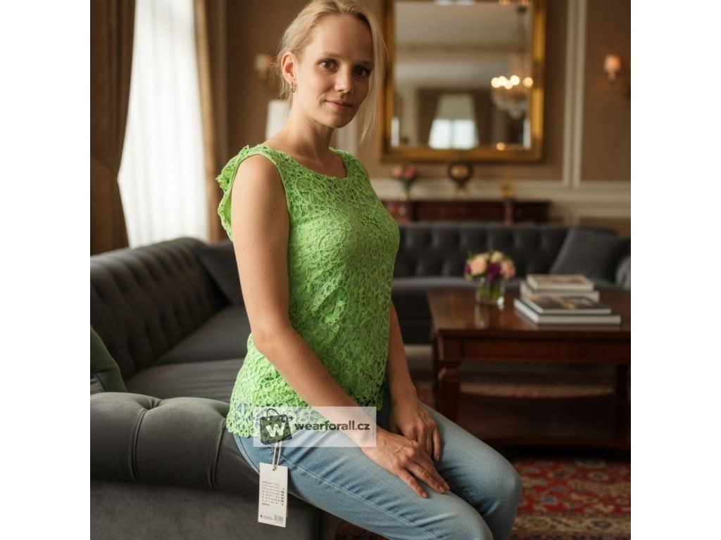 Lehká dámská halenka bez rukávů s jemnou krajkou, která působí žensky a elegantně. Přiléhavý střih krásně zvýrazní postavu a příjemný materiál zajistí pohodlí i během teplých dnů.