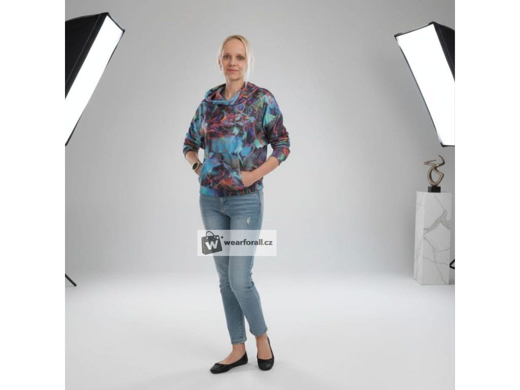Pohodlná klokanka s kapucí a zajímavým vzorem.