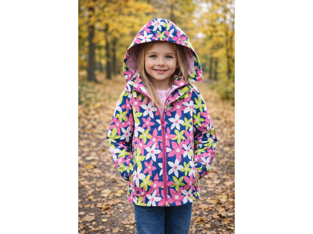 Stylová a praktická dívčí bunda s velkými barevnými květy je ideální na podzimní a jarní chladné dny. Nepromokavý materiál ji činí vhodnou i do deště a větru.