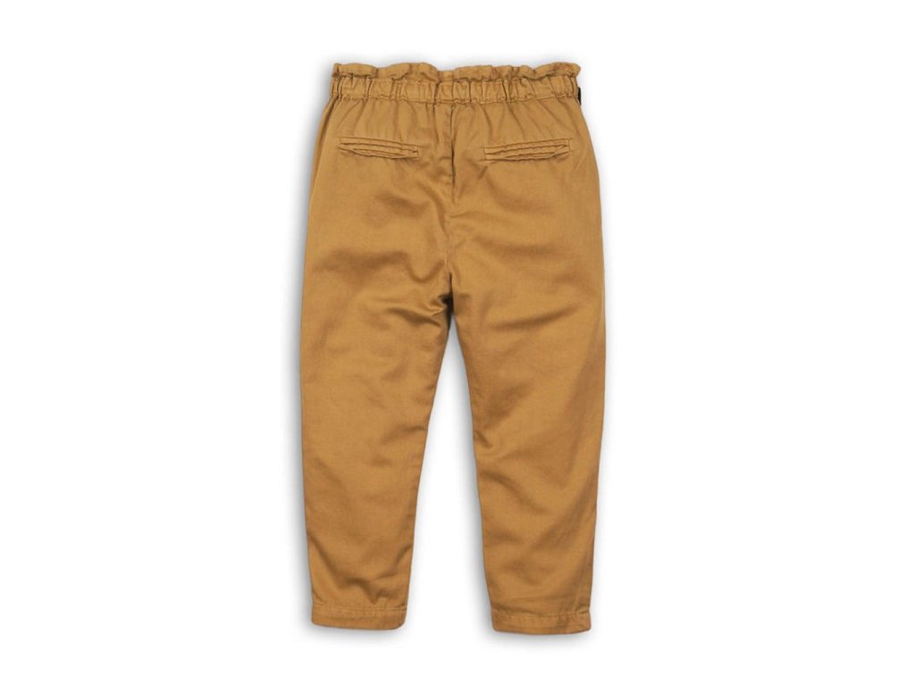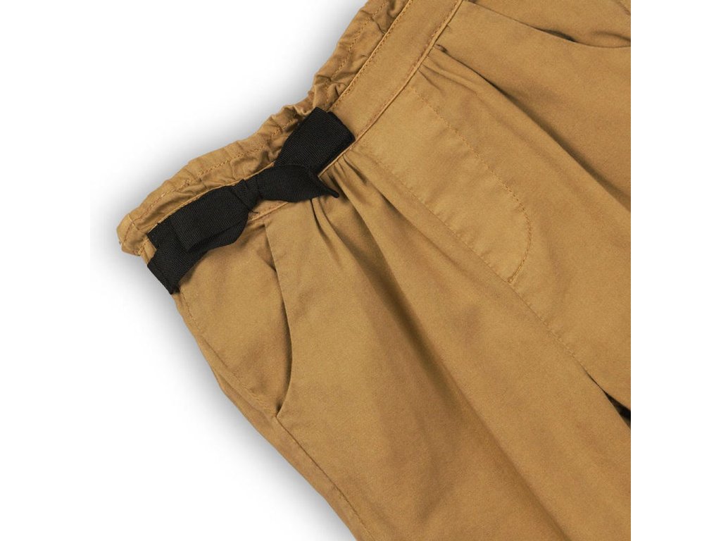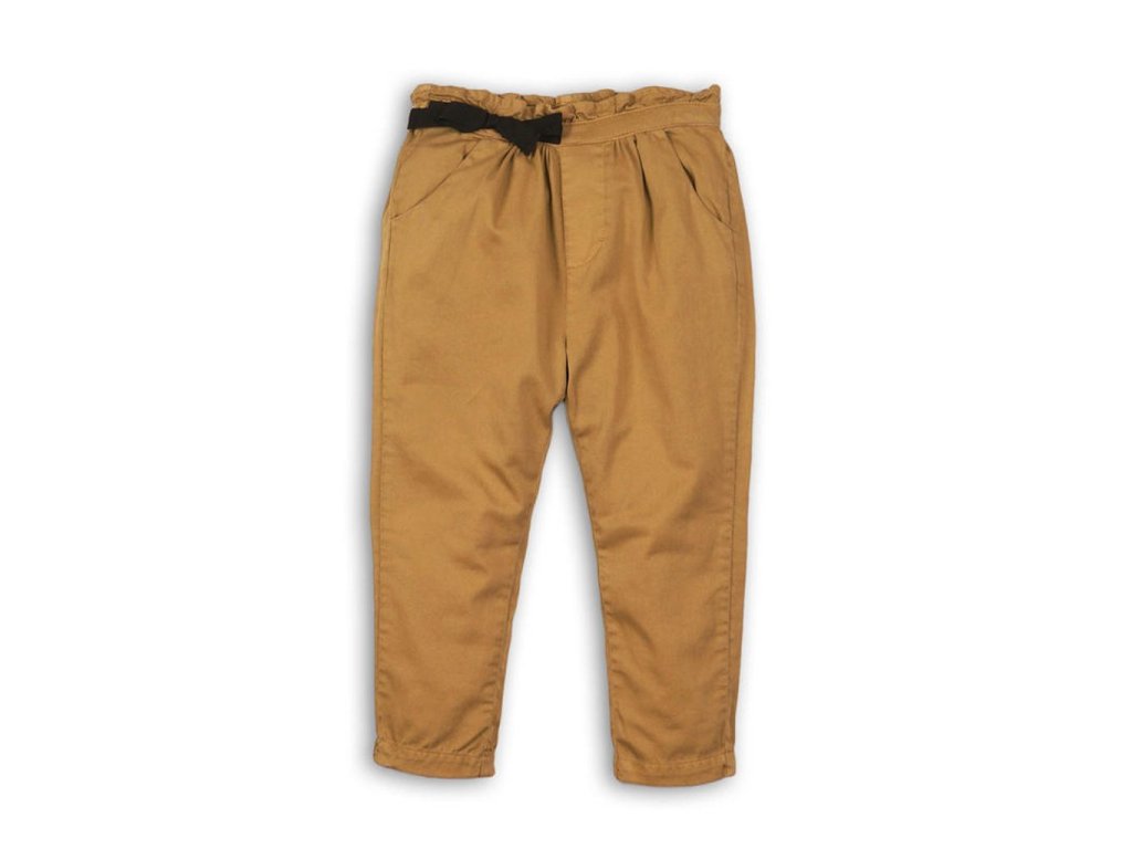 Stylové dívčí kalhoty s řaseným pasem a černou ozdobnou mašlí. V hnědém provedení s dvěma praktickými předními kapsami.