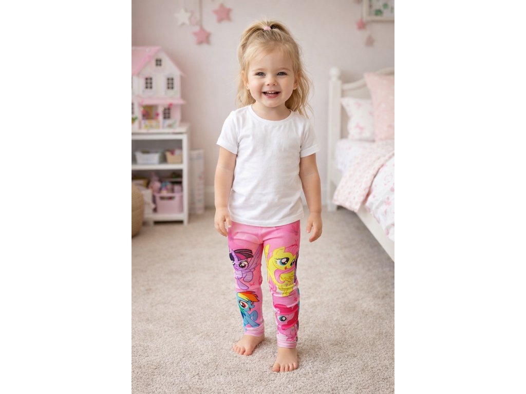 Dívčí legíny My Little Pony zaujmou svou vysokou elasticitou a pohodlným střihem, který se krásně přizpůsobí postavě. Jsou ušity z kvalitního polyesterového materiálu s podílem elastanu, díky čemuž jsou měkké, pružné a příjemné na nošení. Celolátkové motivy kouzelných poníků zajišťují dlouhou životnost vzoru.