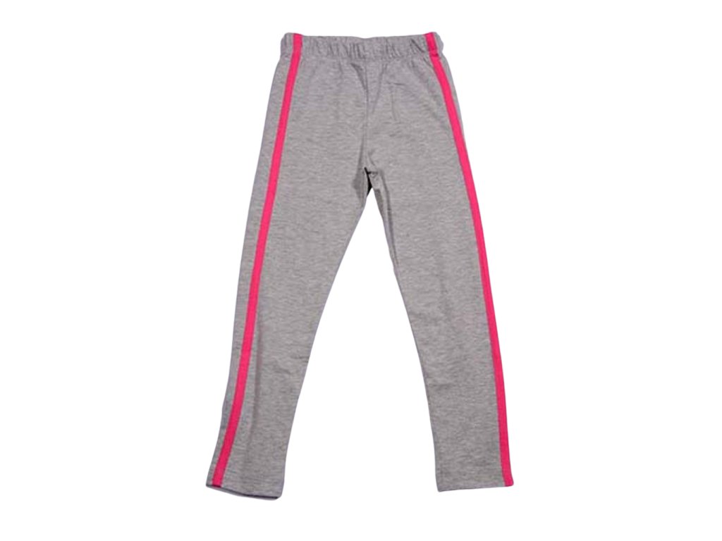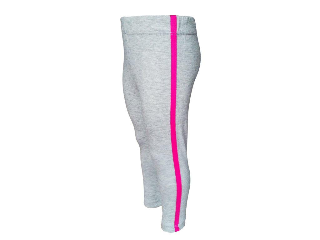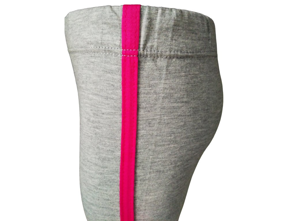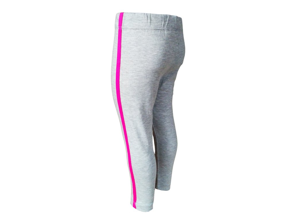 Šedé dívčí legíny s elegantním růžovým lampasem na nohavicích. Díky výborné pružnosti krásně sedí a snadno se přizpůsobí postavě.