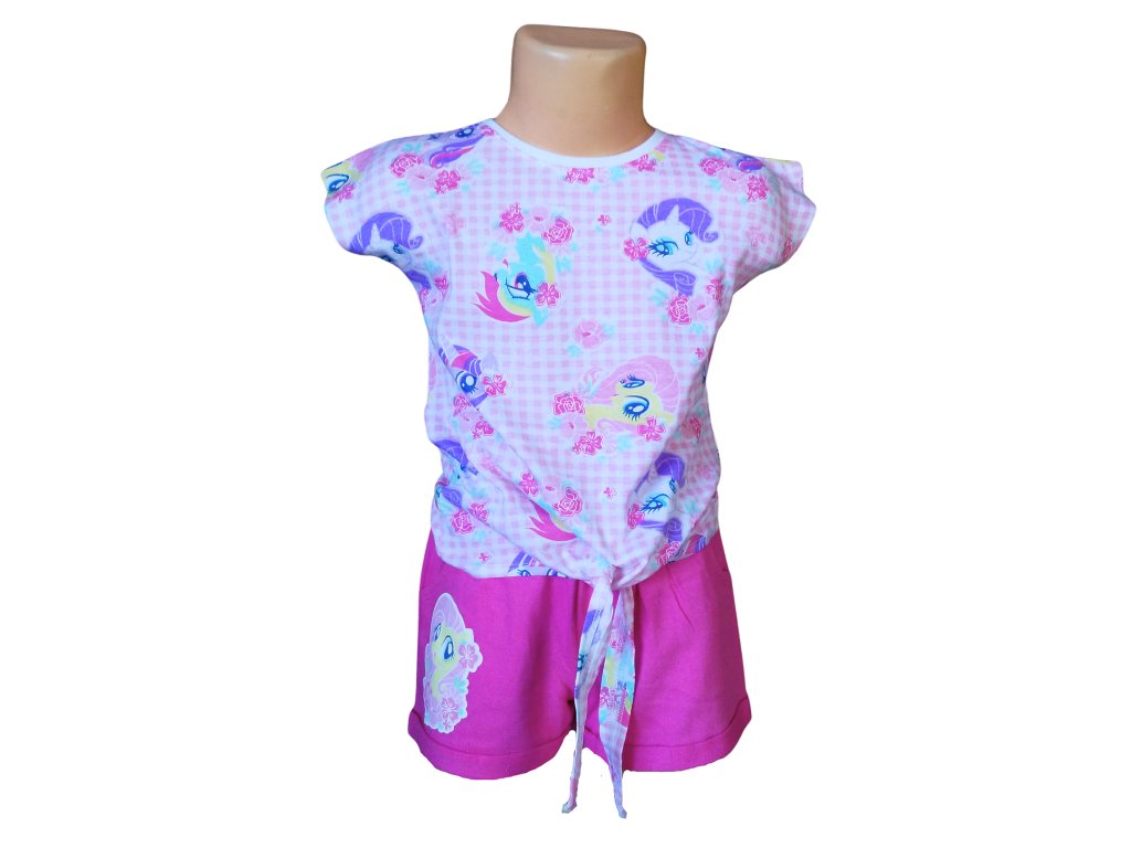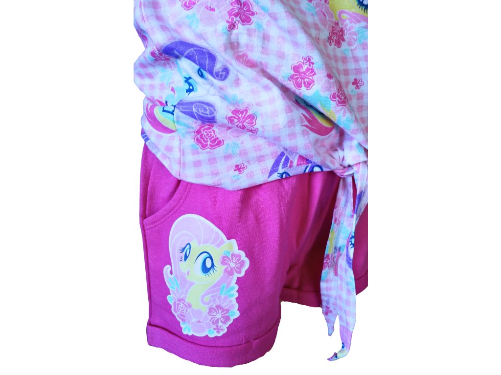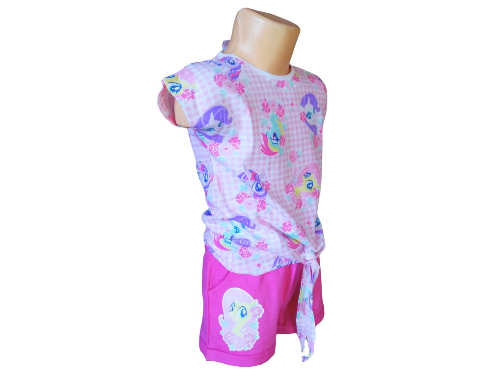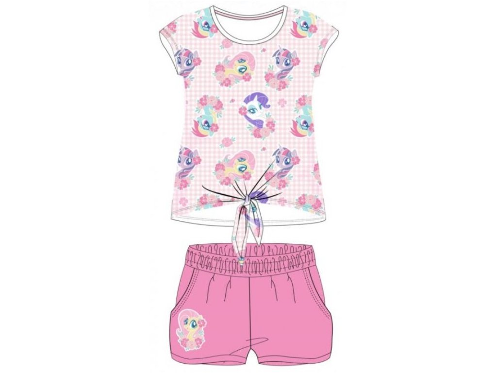 Velmi povedený dívčí letní set My Little Pony. Tričko s celolátkovými motivy je ozdobeno uzlíkem na bříšku, který dodává celému kompletu hravý šmrnc. Šortky mají boční kapsy a extra pružnou gumu v pase pro pohodlné nošení.