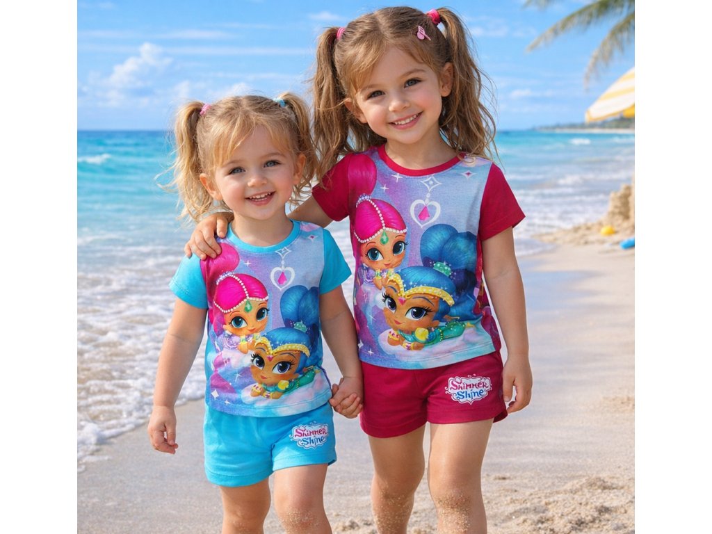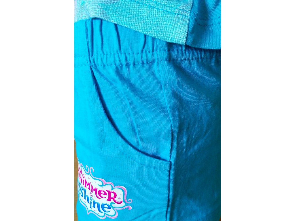 Krásný a pohodlný letní set pro dívky. Vyniká výraznými, jasnými barvami. Šortky jsou vybavené kapsami a mají velmi pružný pas, který se dobře přizpůsobí. Motiv na tričku je z čisté bavlny.