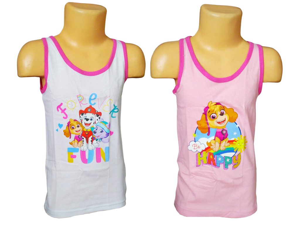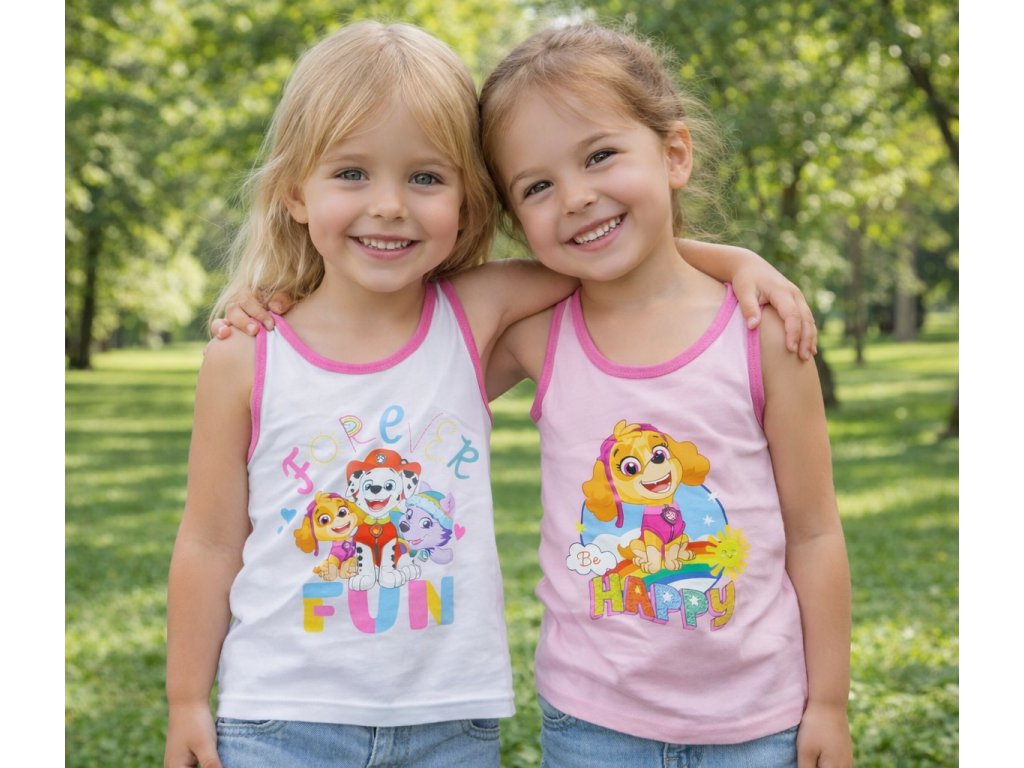 Bavlněné letní tílko Paw Patrol v praktickém balení 2 kusů. Jedno bílé a jedno růžové, každé s jiným motivem oblíbených hrdinů Skye, Everest a Marshall. Veselé barvy rozzáří každý letní den.