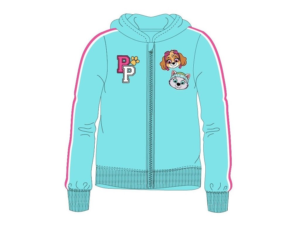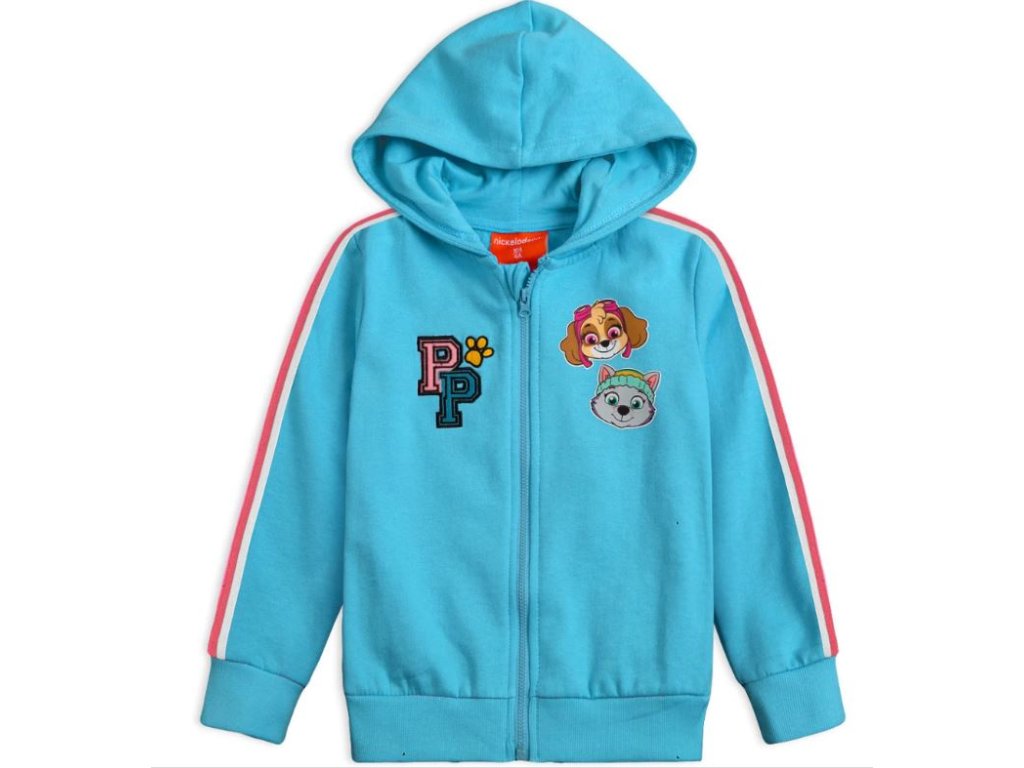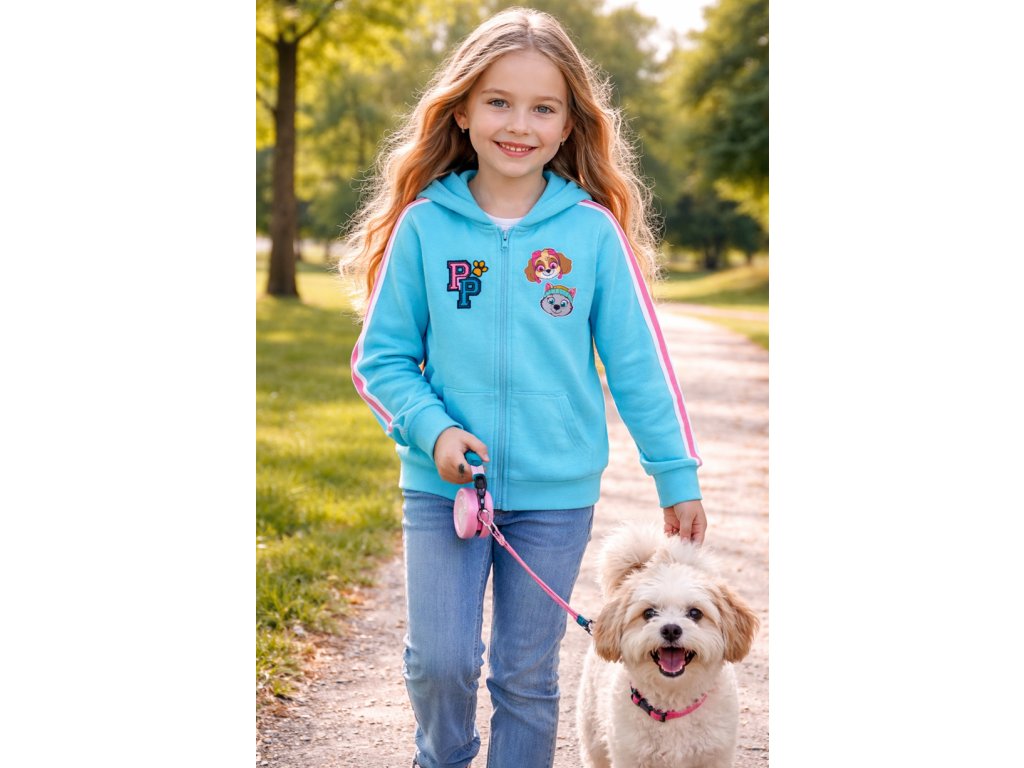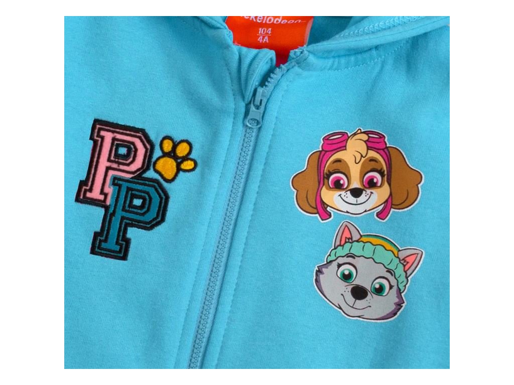 Modrá dívčí mikina Paw Patrol s potiskem Skye a Everesta. Hřejivá, pohodlná, zip s ochranou u krku a pružné manžety. Jemný chloupek z rubu pro celoroční nošení.