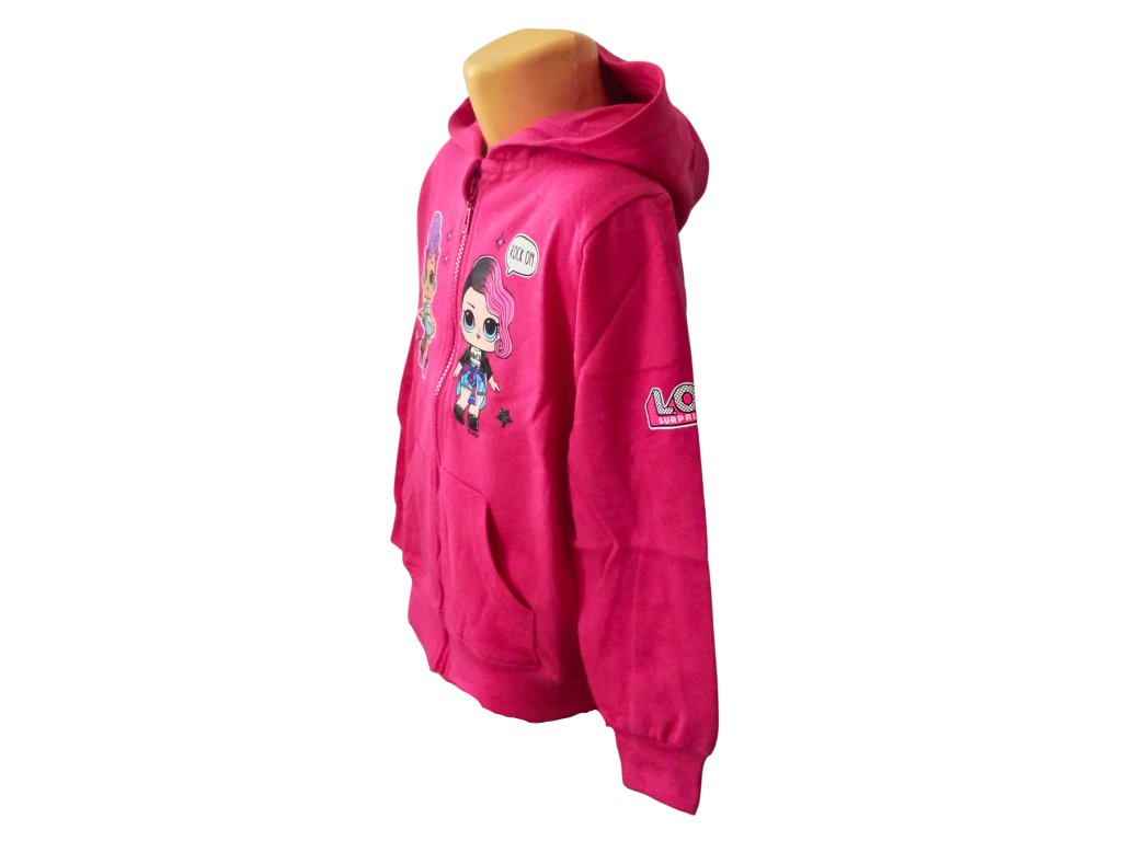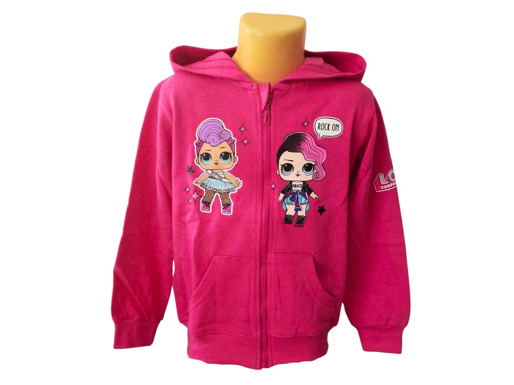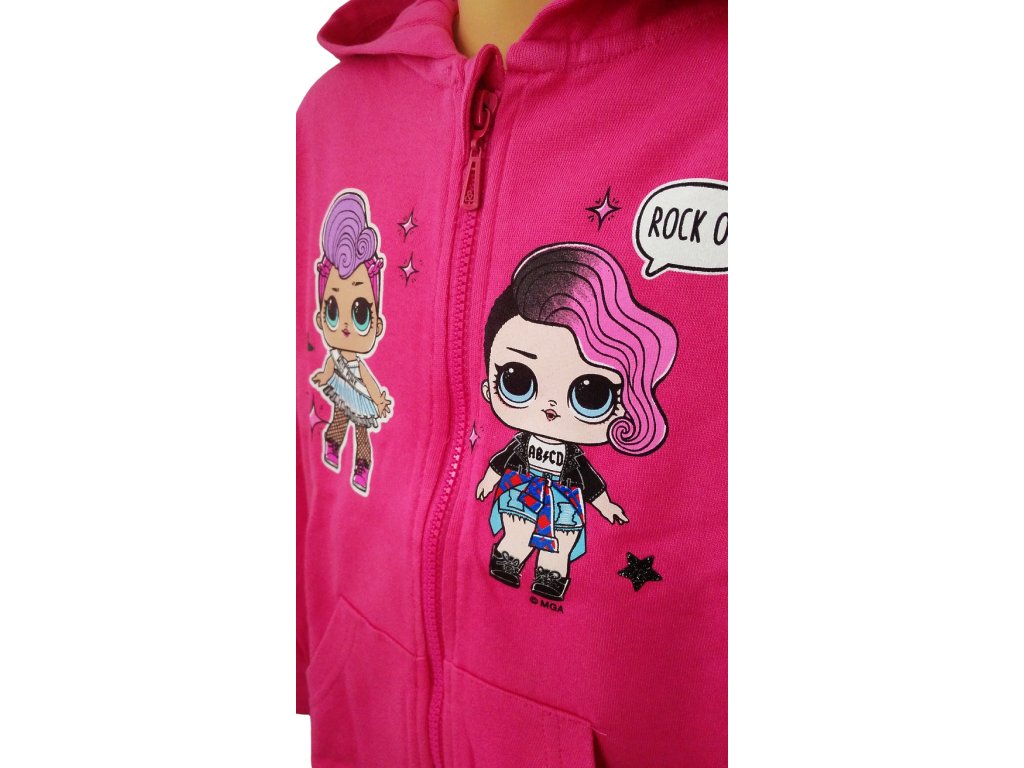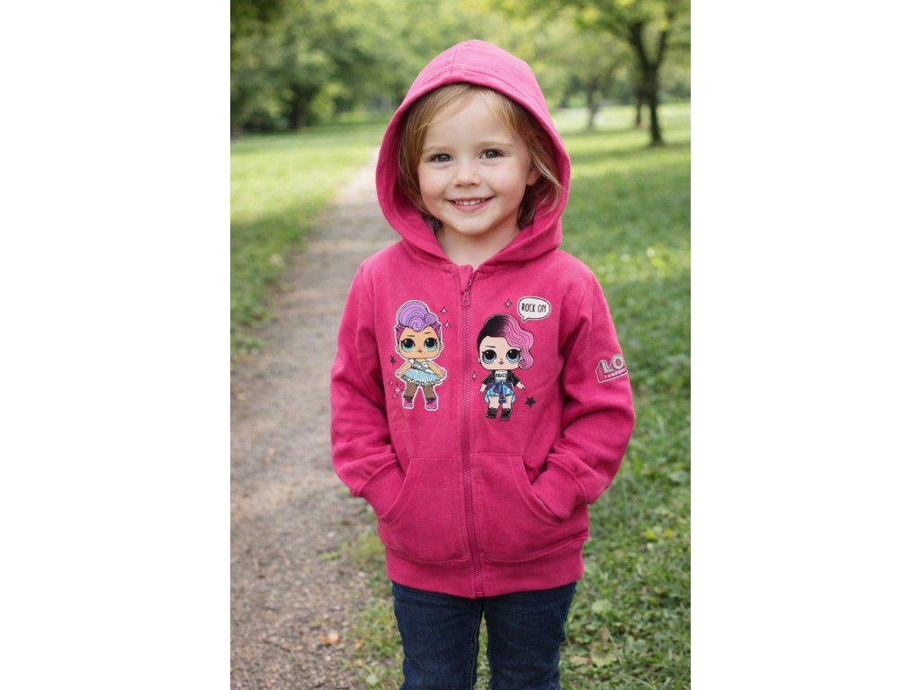 Krásná růžová bavlněná mikina s panenkami LOL je oblíbeným kouskem do dívčích šatníků. Mikina má zipové zapínání, kapuci a praktické břišní kapsy. Pas a rukávy jsou zakončeny pružnými manžetami. Mikina je nevyteplená, ideální pro celoroční nošení.