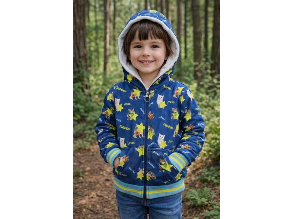 Dívčí mikina s motivem kočiček, kapucí s měkkou chlupatinkou, klokaními kapsami, pružnými manžetami a zipem. Pohodlná a hřejivá.