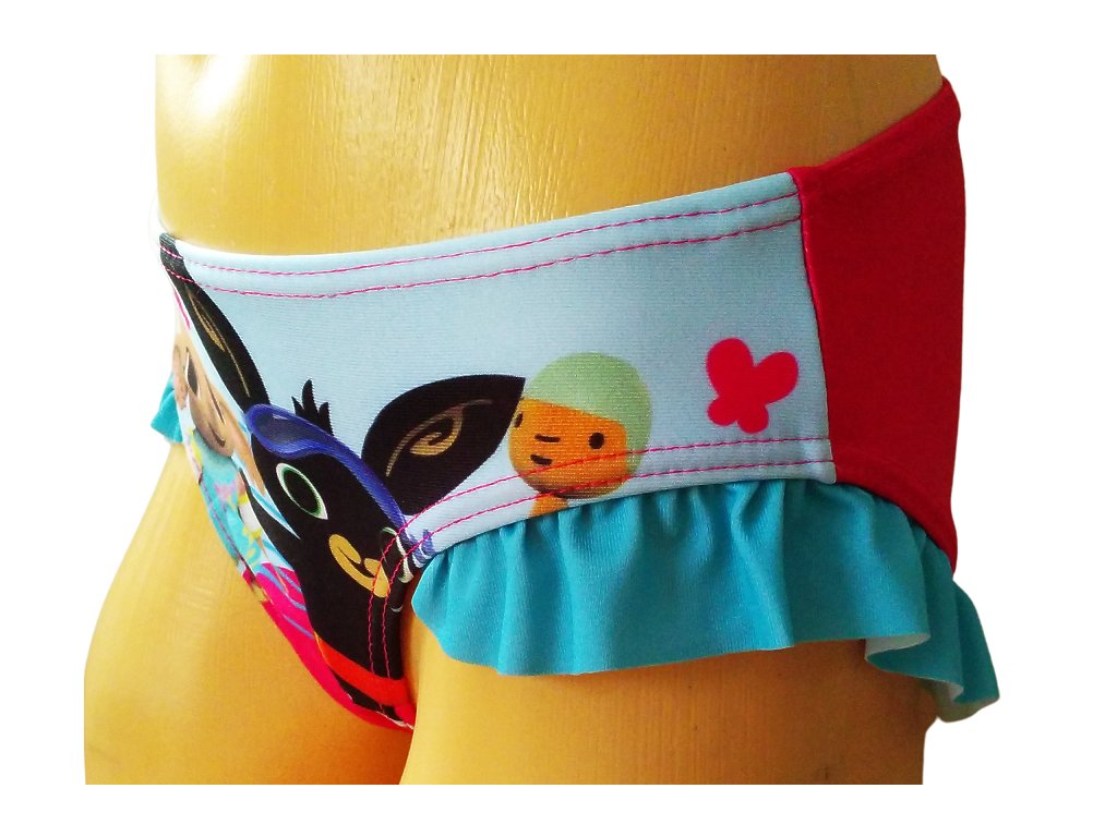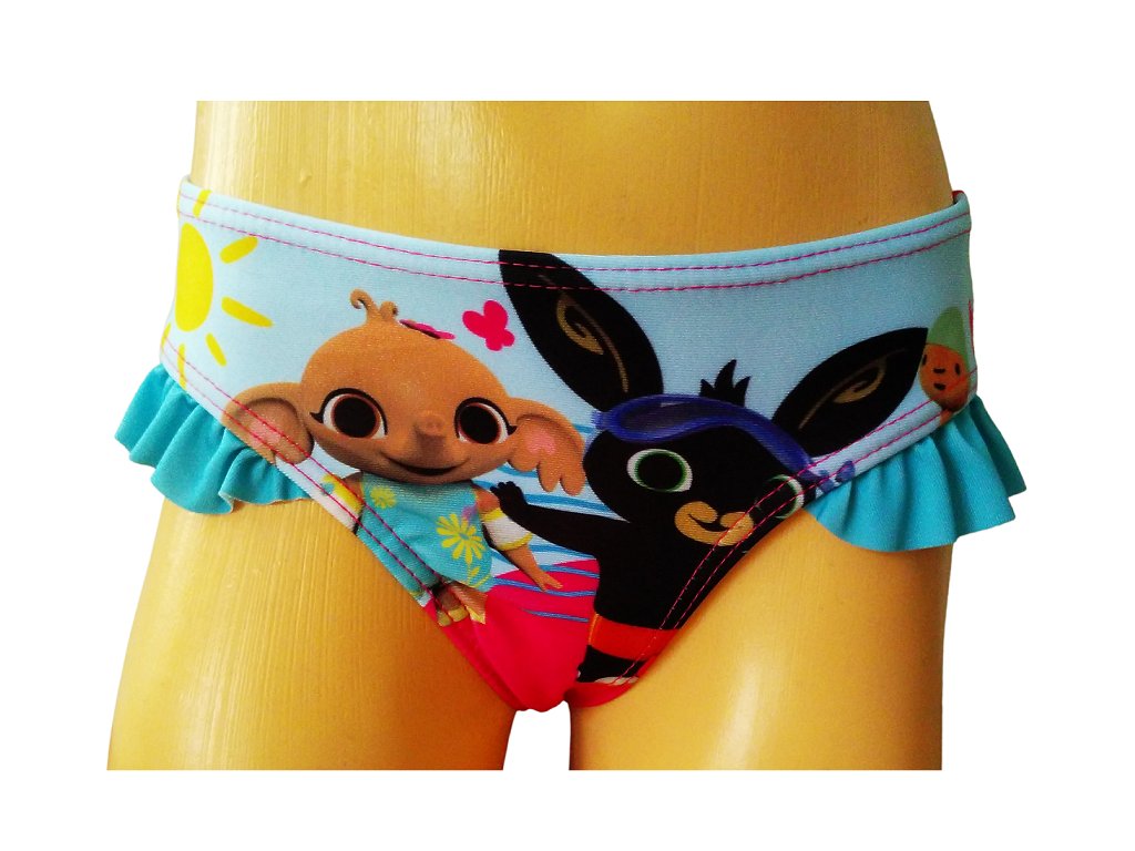 Dívčí plavky s motivem Binga jsou krásné a pohodlné plavky pro malé plavkyně. Příjemně pružný materiál zajišťuje komfort při koupání i hrách u vody. Látkové motivy a slušivé, bohatě řasené volánky dodávají plavkám hravý a dívčí vzhled.