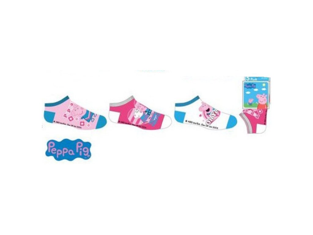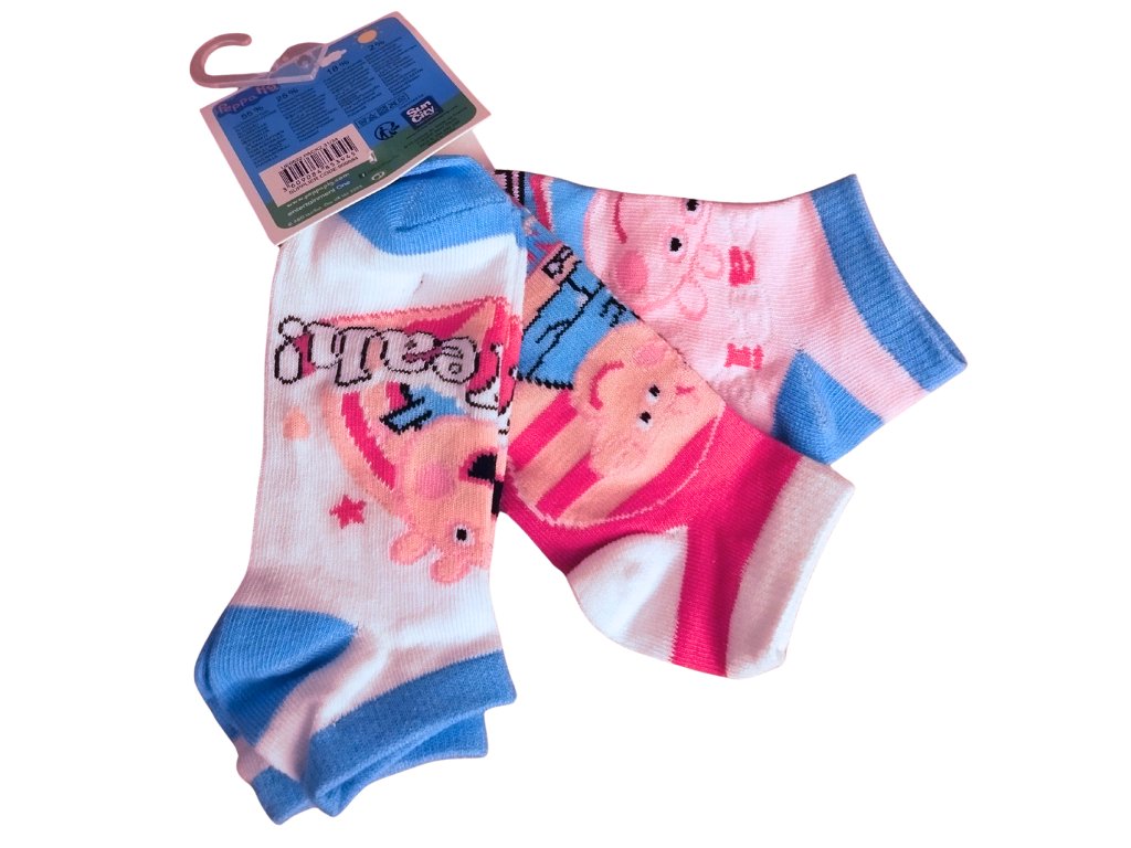 Sada 3 párů barevných kotníkových ponožek s motivem prasátka Pepiny. Vyrobeny z kvalitní bavlny s vysokým podílem přírodního materiálu, skvěle pruží a pohodlně sedí na nožce. Ideální doplněk do školky, do města i na doma.