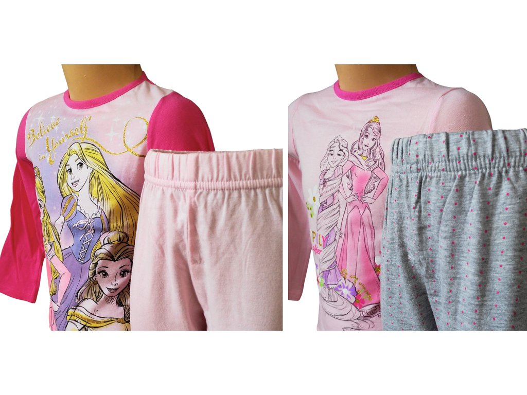 Krásné dívčí bavlněné pyžamo určené pro malé princezny. Pyžamo s pohádkovými motivy princezen zajistí pohodlný spánek a kouzelné sny. Látkové obrázky jsou jemně doplněny zlatými třpytkami, které dodávají pyžamu elegantní a slavnostní vzhled.