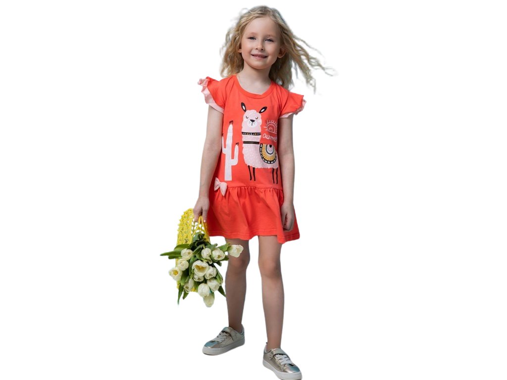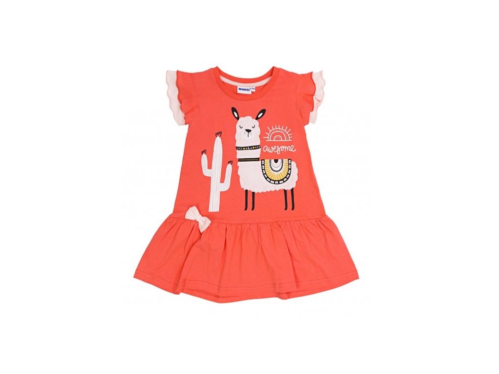 Tyto krásné a pohodlné šaty s krátkým rukávem jsou ideální pro všechny malé parádnice. Korálová barvička spolu s roztomilou lamou je dělá nepřehlédnutelnými. Pohodlí zajistí jemná, kvalitní bavlna a střih, který se postupně rozšiřuje – šaty tak krásně padnou a umožní volný pohyb při hře i odpočinku.