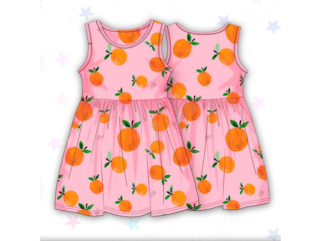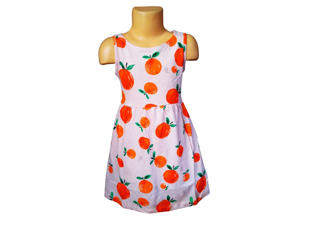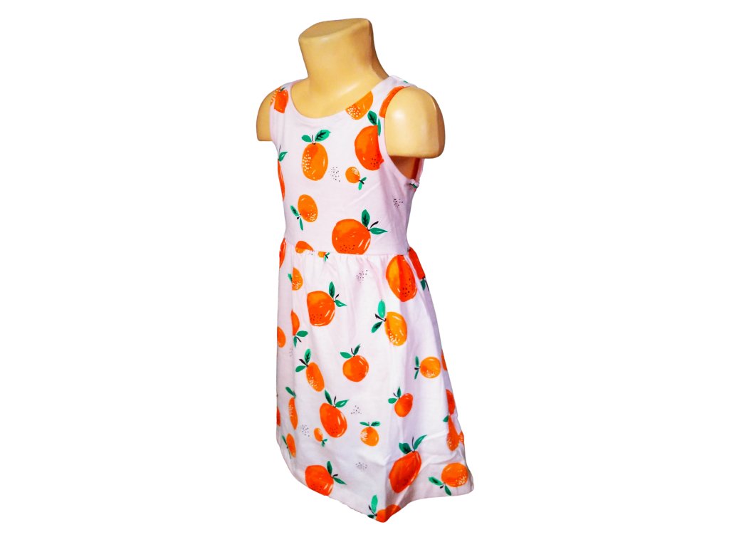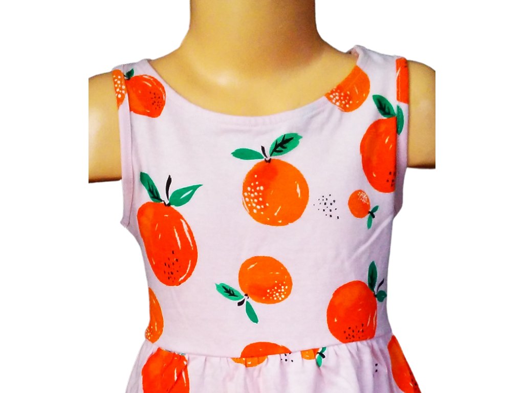 Krásné a veselé letní šaty, ideální pro teplé dny – do města, do školy, na doma i na zahradu. V pase je pohodlná pružná guma, která nikde netlačí a umožňuje dětem volný pohyb při běžných denních aktivitách. Látkové motivy pomerančů dodávají šatům hravý vzhled a střih je navržen tak, aby byl maximálně pohodlný.