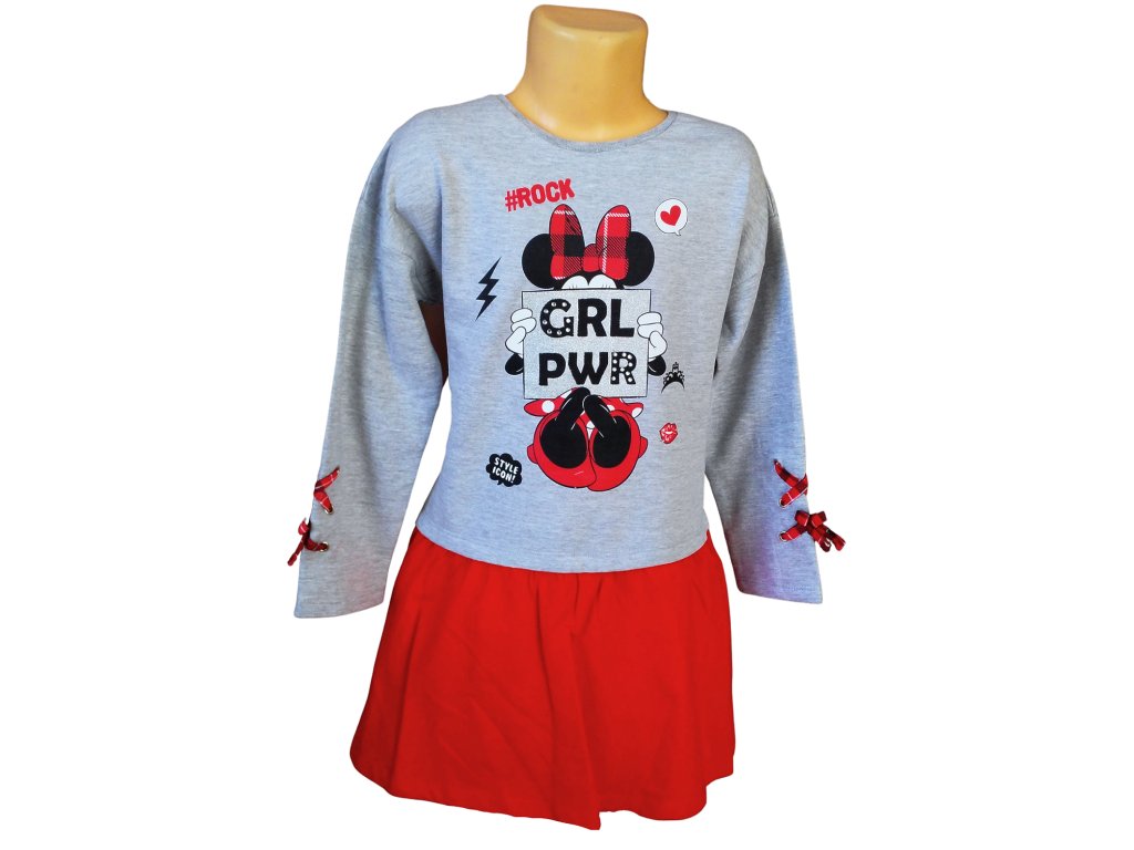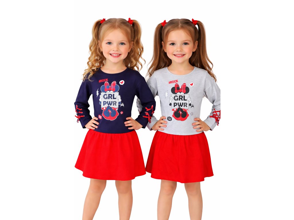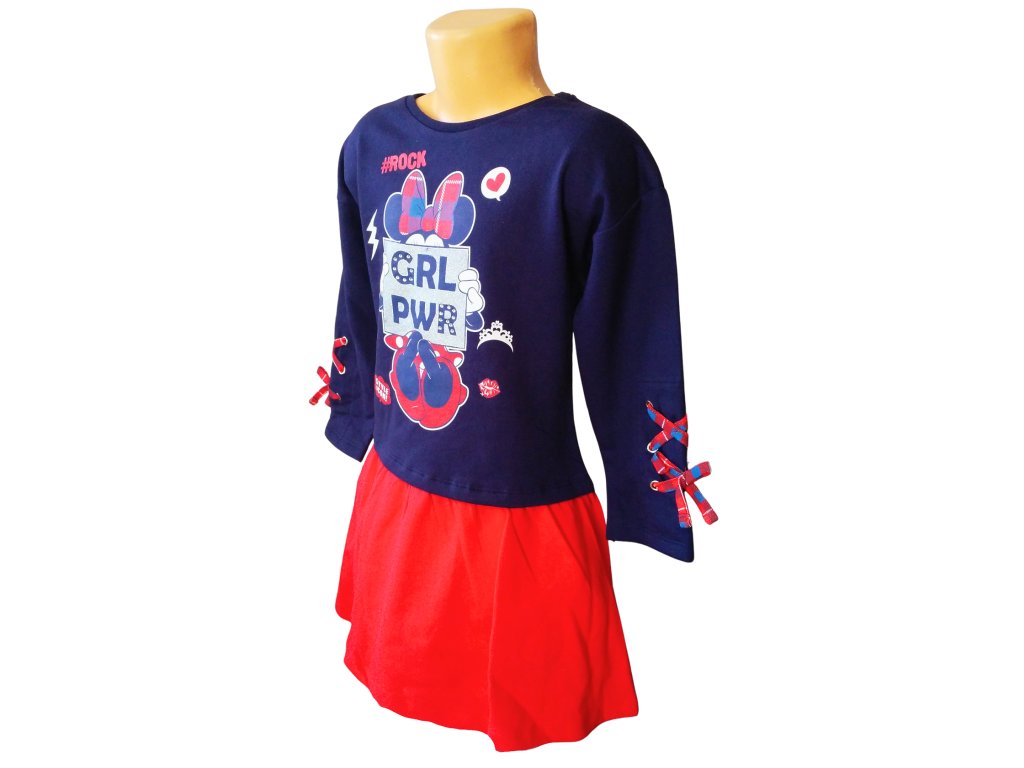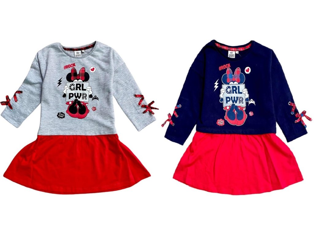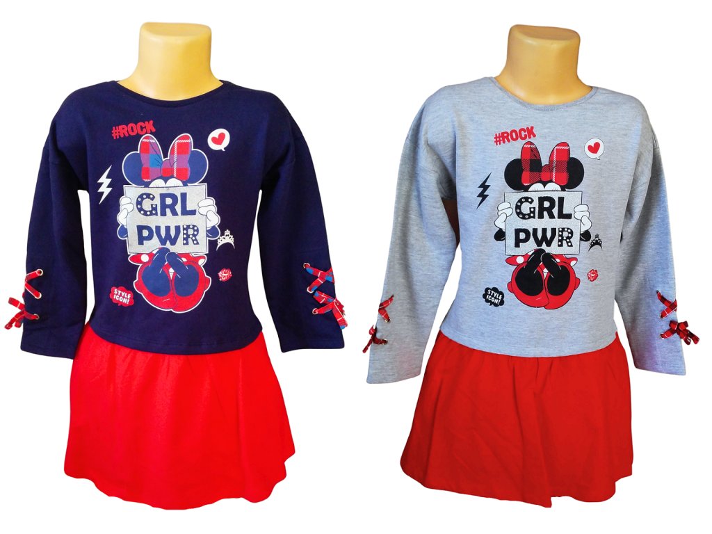 Dívčí teplákové šaty Minnie s dlouhým rukávem jsou ideální pro chladnější dny. Šaty jsou příjemně hřejivé, velmi pohodlné a umožňují holčičkám volný pohyb při všech běžných aktivitách. Motiv myšky Minnie je zdoben třpytkami a drobnými kamínky, rukávy mají stylovou imitaci šněrovačky. Originální design zaručí, že se šaty holkám budou opravdu líbit.