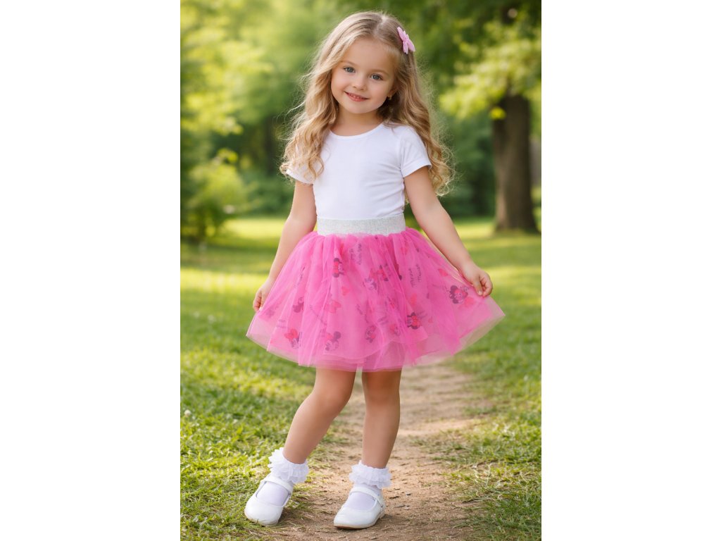 Bohatě řasená dívčí sukně s vrchní tylovou vrstvou a celoplošným motivem na spodní sukýnce. Pohodlný pas s gumou zdobenou stříbrnou metalickou nití dodává sukně slavnostní vzhled a komfort při nošení.
