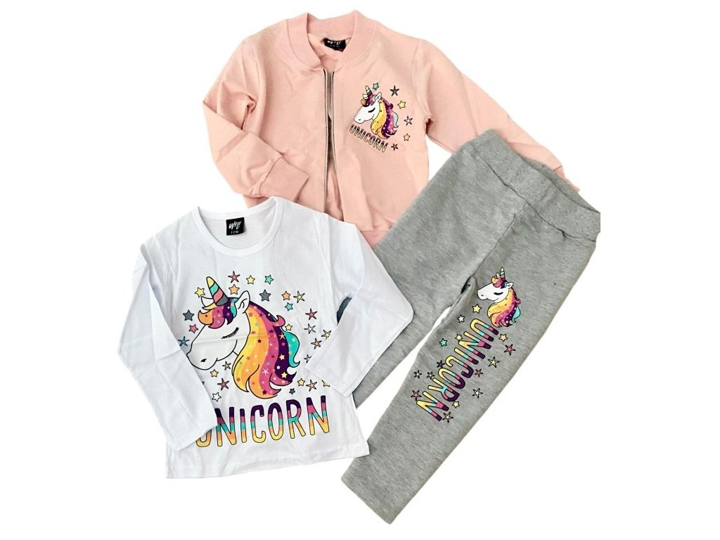 Úžasný bavlněný set pro holčičky, který obsahuje mikinu, pohodlné tepláky a tričko s dlouhým rukávem. Každý kousek je ozdoben potiskem s motivem duhového jednorožce. Souprava je lehčí a skvěle se hodí na jaro, léto i podzim. Mikina má zapínání na zip a rukávy zakončené pružnými manžetami. Tepláky jsou v pase opatřeny vyšší pružnou gumou, která zajišťuje maximální pohodlí. Motiv na tričku září duhovými barvami a je doplněn třpytkami, které dodávají celému setu kouzelný vzhled.