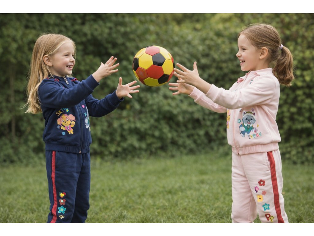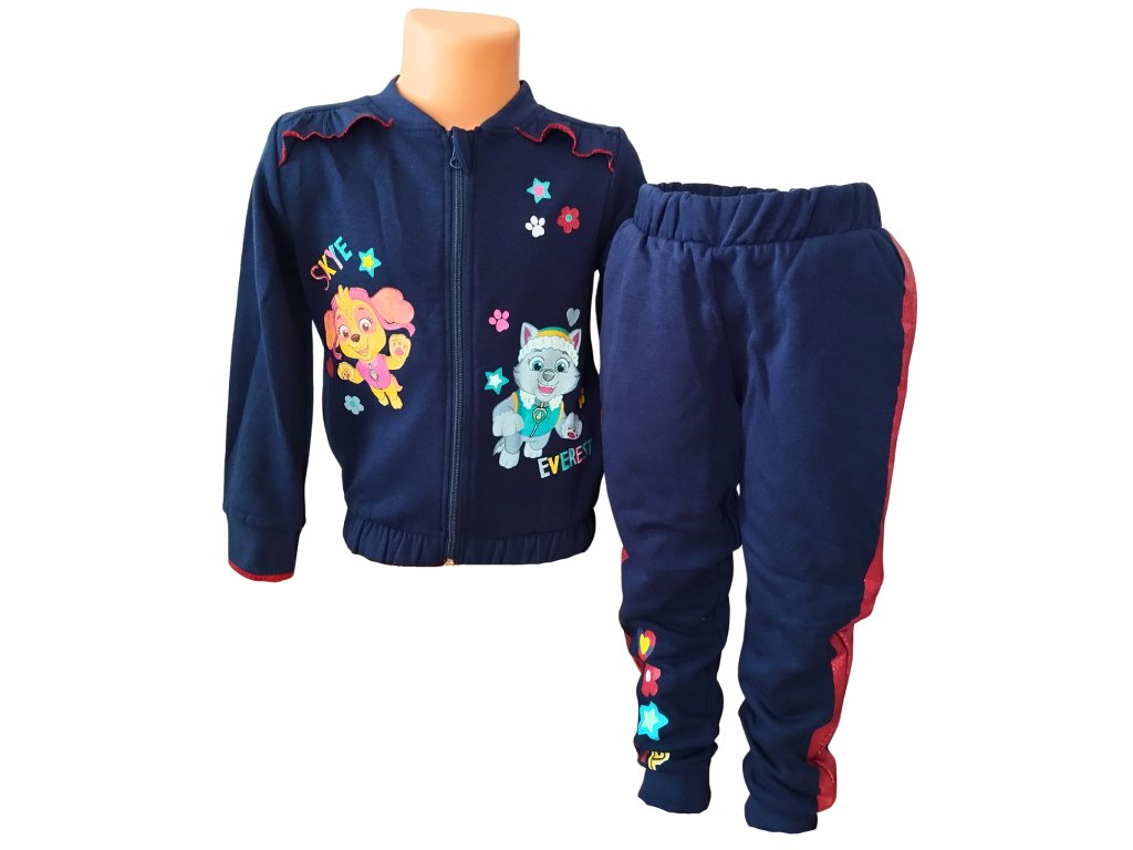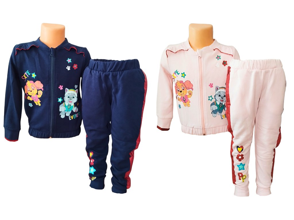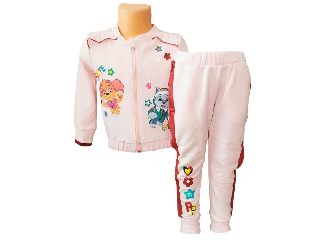 Překrásná tepláková souprava Paw Patrol pro holčičky s motivem Skye a Everest je ideální volbou do chladnějších dnů. Díky jemnému česanému chloupku na vnitřní straně je krásně hřejivá a velmi příjemná na nošení. Souprava je vyrobena z materiálu s vysokým podílem kvalitní bavlny, který zajišťuje maximální pohodlí. Mikina má velkoplošné motivy, zapínání na zip, dvě boční kapsy a je doplněna potiskem na rukávu i jemnými volánky v oblasti ramen. Tepláky mají v pase pohodlnou vyšší pružnou gumu, praktické postranní kapsy a výrazné třpytivé lampasy, které dodávají soupravě moderní vzhled.