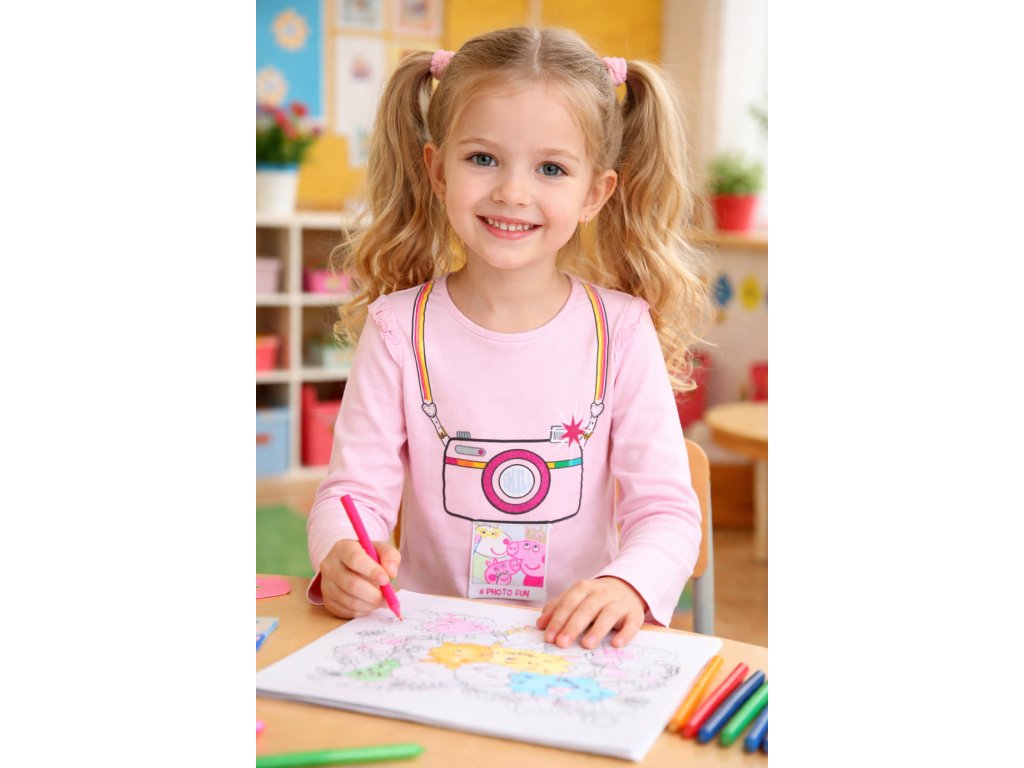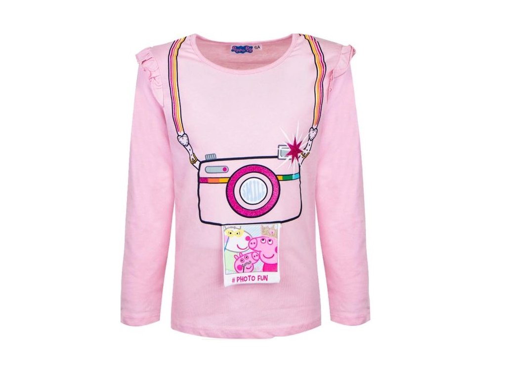 Parádní tričko s oblíbeným prasátkem. Tričko Peppa Pig uvítají děti v chladnějším období, kdy dlouhý rukáv zahřeje. Tričko je zdobeno třpytkami a také drobným volánkem na ramenou.
