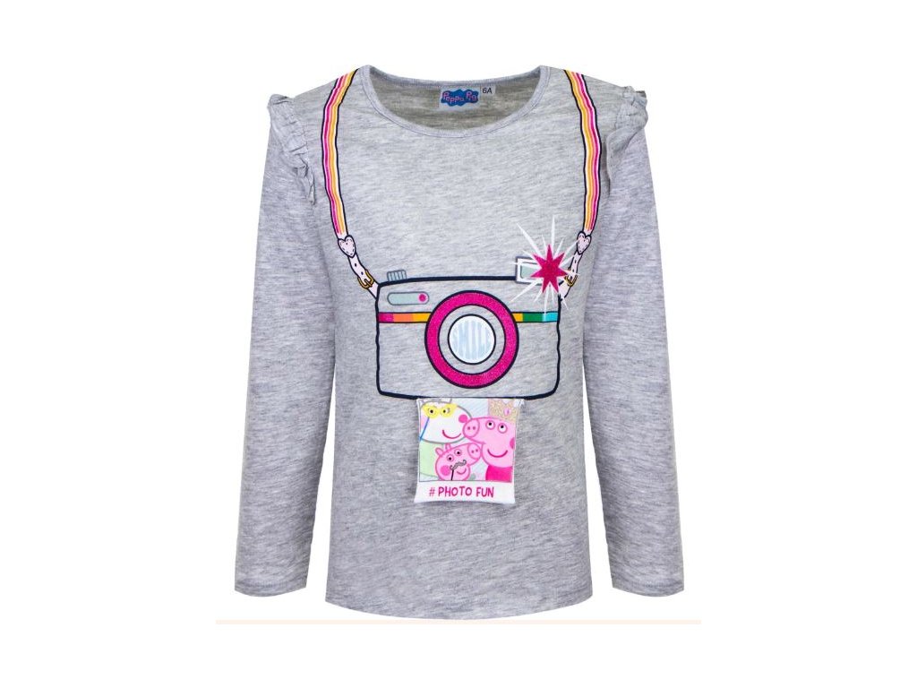 Velmi příjemné a originální tričko s dlouhým rukávem pro holky s oblíbenou Peppou Pig a motivem připomínajícím fotografii. Tričko je vhodné do chladnějšího počasí, příjemně pružné a zdobí ho třpytky i jemný volánek na ramenou.