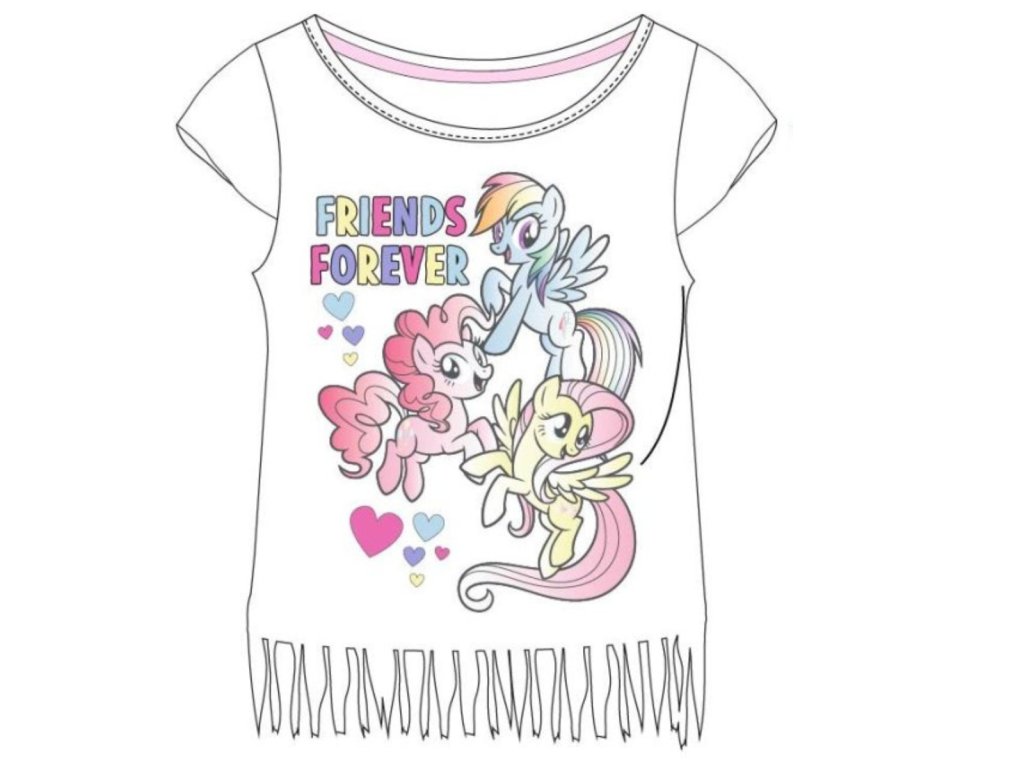 Krásné bavlněné tričko My Little Pony potěší všechny malé milovnice kouzelných koníků. Zaujme stylovými třásněmi a skvěle se hodí například k jednobarevným legínám. Motiv na tričku je vyroben z bavlněného materiálu a je příjemný na nošení.