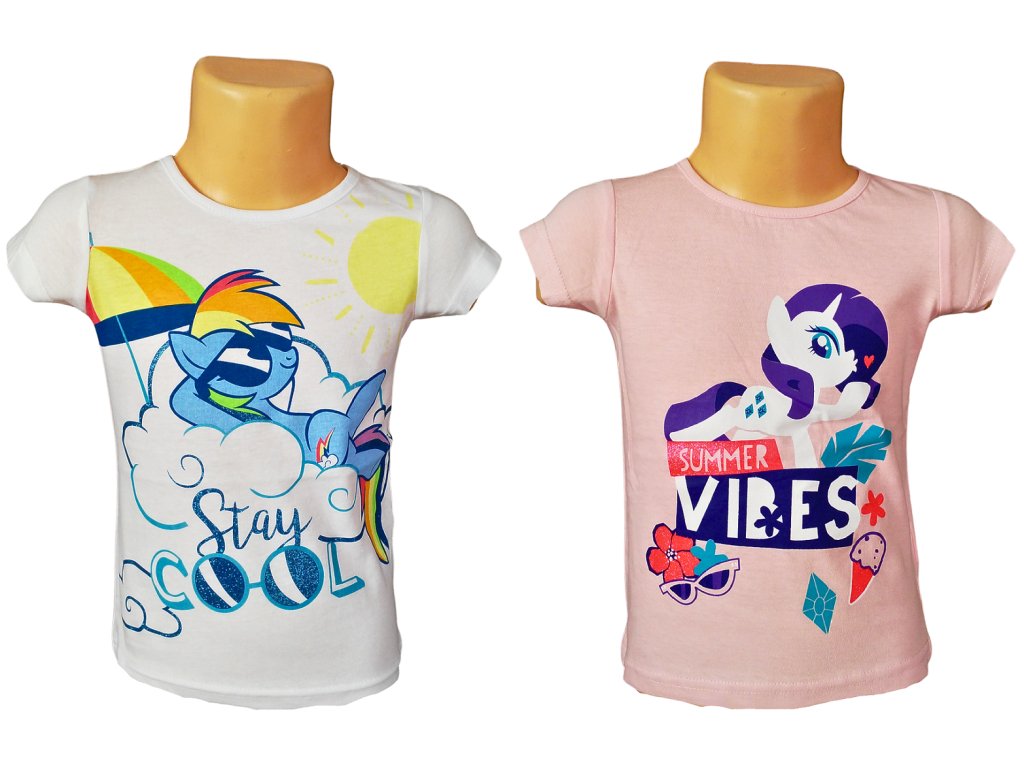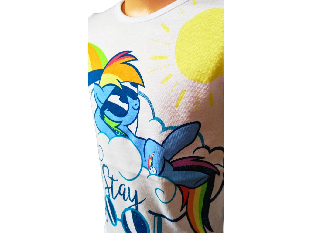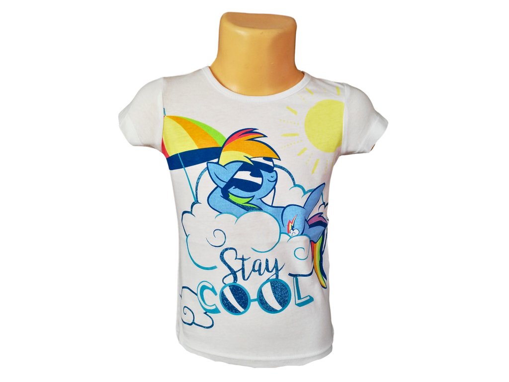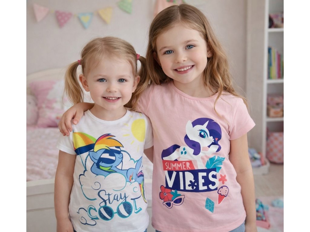 Příjemné tričko s krátkým rukávem pro holčičky, které milují kouzelné poníky. Bílá varianta je doplněna látkovým motivem jemně ozdobeným třpytkami. Tričko je pružné, dobře se přizpůsobí postavě a je ideální pro každodenní nošení, hraní i další běžné dětské aktivity.