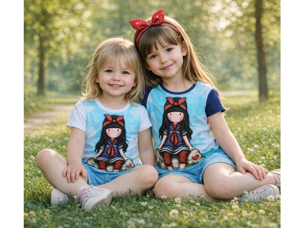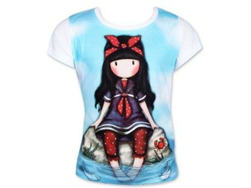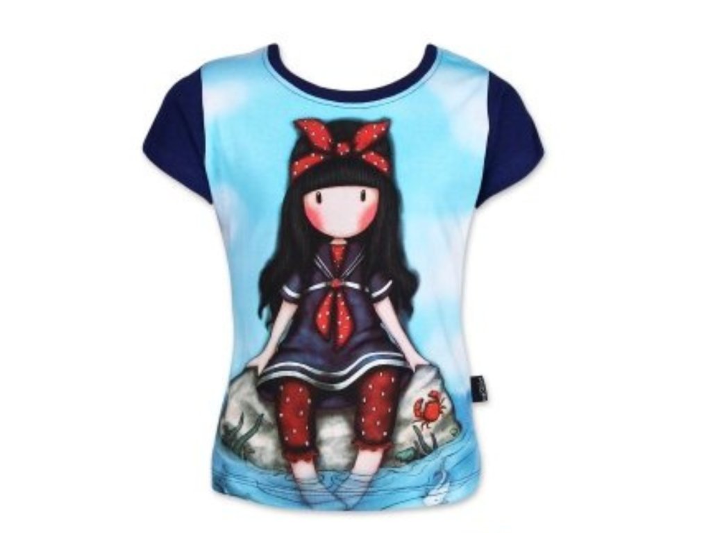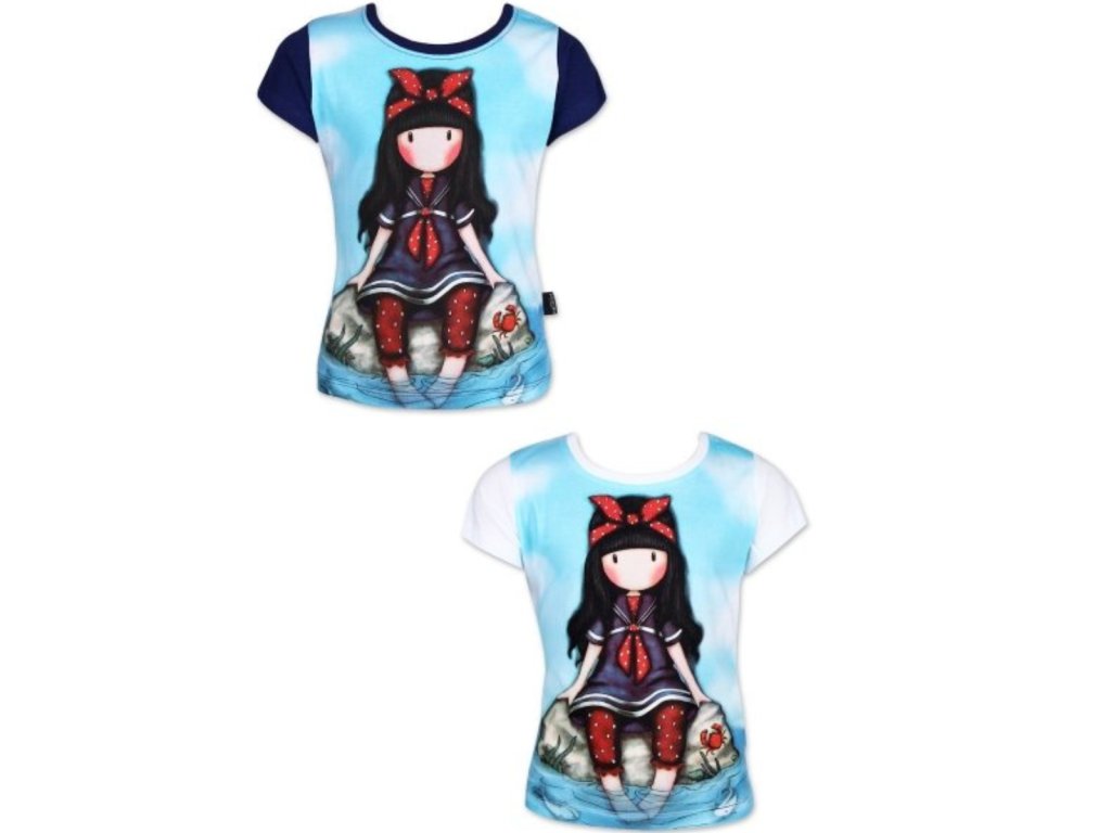 Krásné dívčí tričko s oblíbeným motivem panenky Santoro. Tričko je ve 2 provedeních - bílá a modrá zadní část. Motiv je celobavlněný.