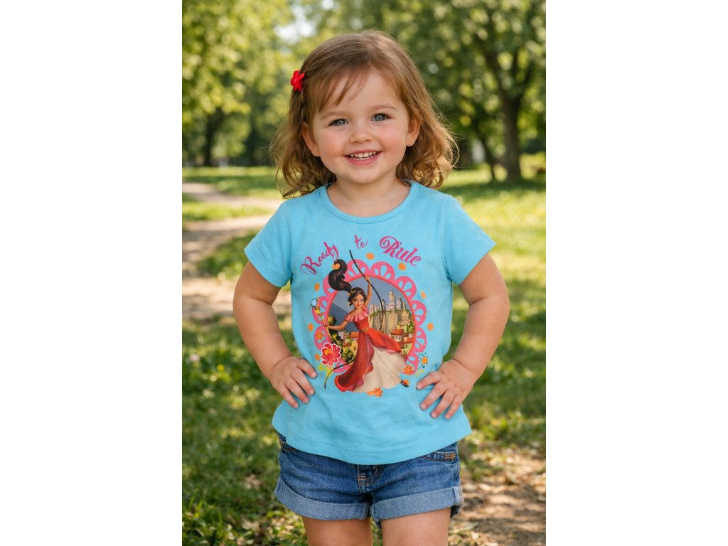 Pohodlné dívčí tričko s krátkým rukávem a krásným holčičím motivem Eleny z Avaloru. Volný střih se bude hodit na různé typy postavy a jemný odstín modré bude ladit s mnoha doplňky z dětského šatníku.