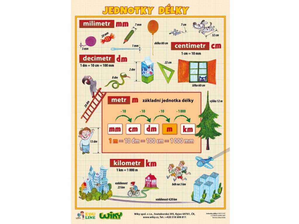 Obsah přední strany tvoří jednotky délky mm, cm, dm, m a km s názornými ilustracemi a přehledná tabulka s převody jednotek délky s užitím měnitele 1000, 100, 10. Ilustrace jednotek jsou zvoleny co nejtypičtěji, aby vedly k jejich snadnému zapamatování a také umožňovaly provádět odhad délky a vzdálenosti.
