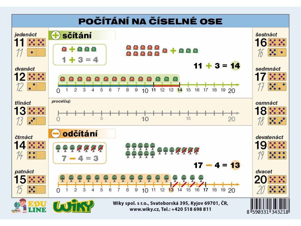 Naučná tabulka POČÍTÁNÍ NA ČÍSELNÉ OSE je dalším příspěvkem k modernizaci výuky matematiky na základních školách. Jednoduchá a přehledná tabulka napomáhá k snadnějšímu osvojení sčítání a odčítání.