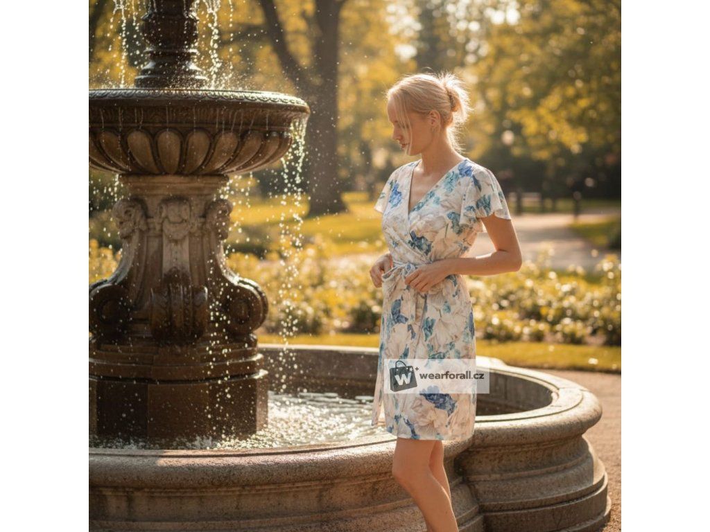 Lehké květinové šaty, které podtrhnou vaši ženskost a jemný styl. Překládaný výstřih krásně zvýrazní dekolt a volánky na rukávech dodávají šatům vzdušný a romantický vzhled. Díky pásku si šaty snadno upravíte přesně podle postavy.