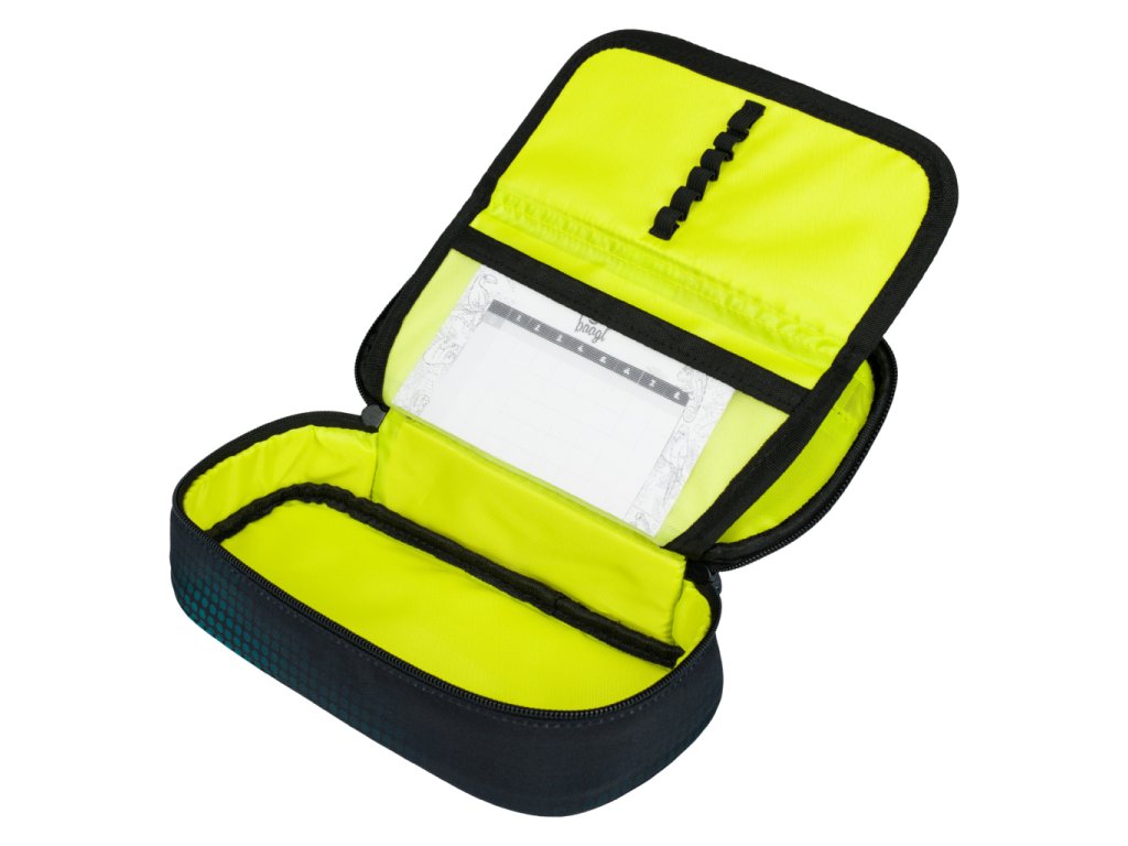 Odolný penál s výklopnou přepážkou, kapsou na zip a přihrádkou na rozvrh. Bez náplně, ideální pro školní potřeby.