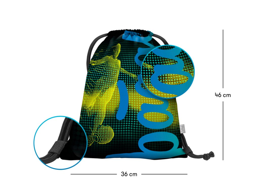 Sáček na obuv nebo drobnosti pro školu či volný čas, vyroben z pevného omyvatelného materiálu. Stahování tkanicemi umožňuje i nošení na zádech.