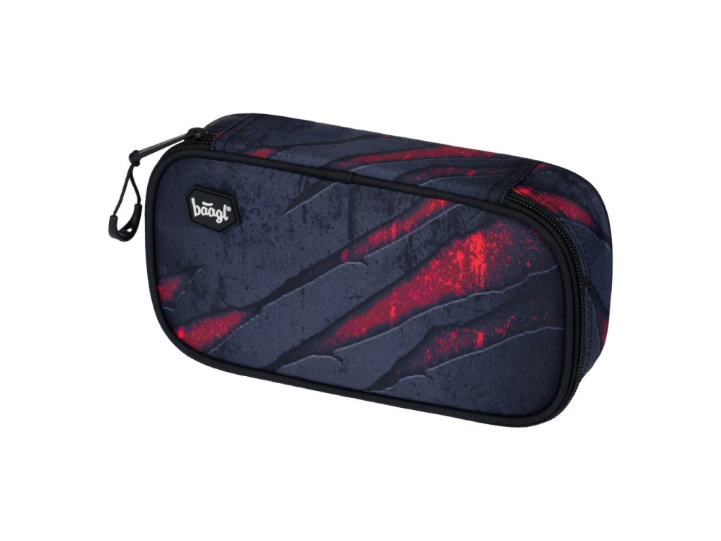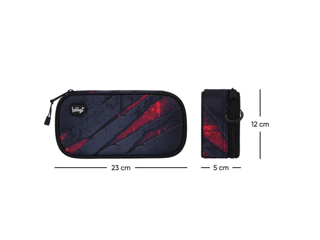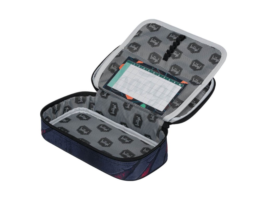 Pevný školní penál s výklopnou přepážkou, vnitřní kapsou na zip a rozvrhem hodin. Bez náplně.