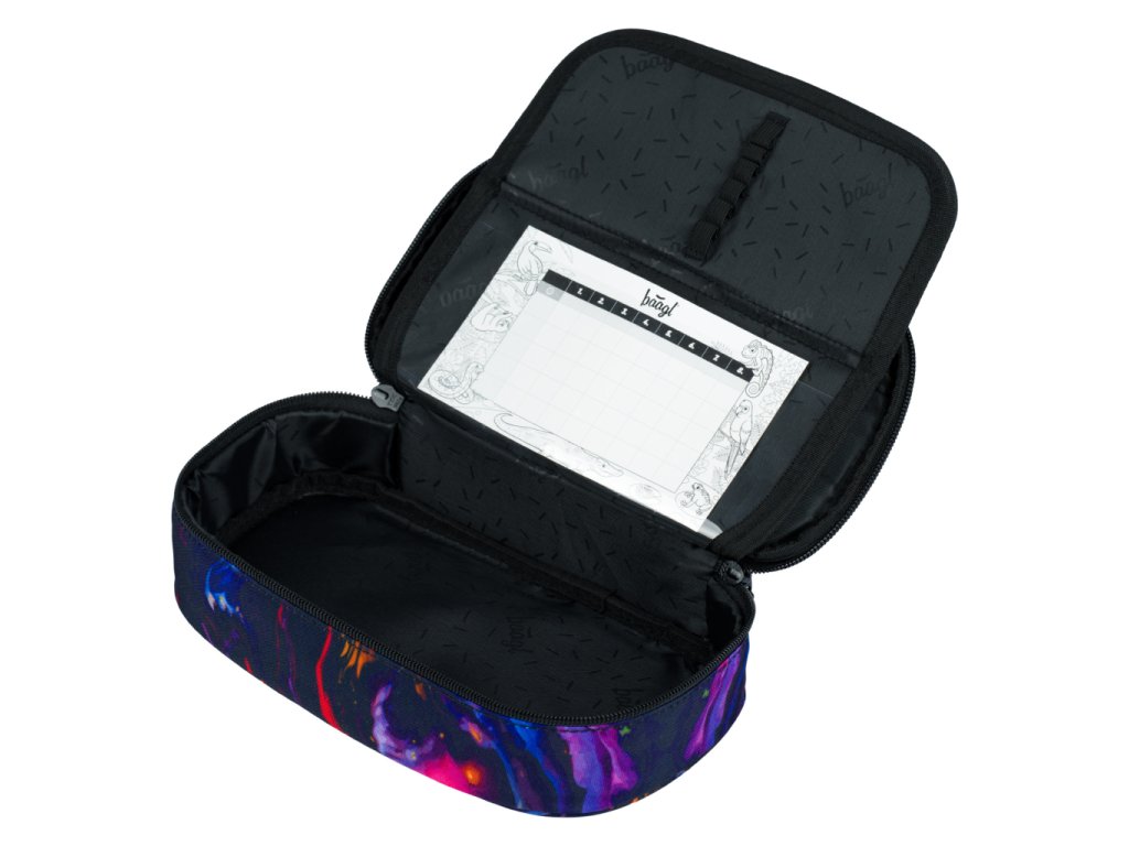 Pevná školní etue s výklopnou přepážkou, kapsou na zip a přihrádkou na rozvrh. Vyrobena z recyklovaného materiálu, se značkovými zipy YKK. Bez náplně.