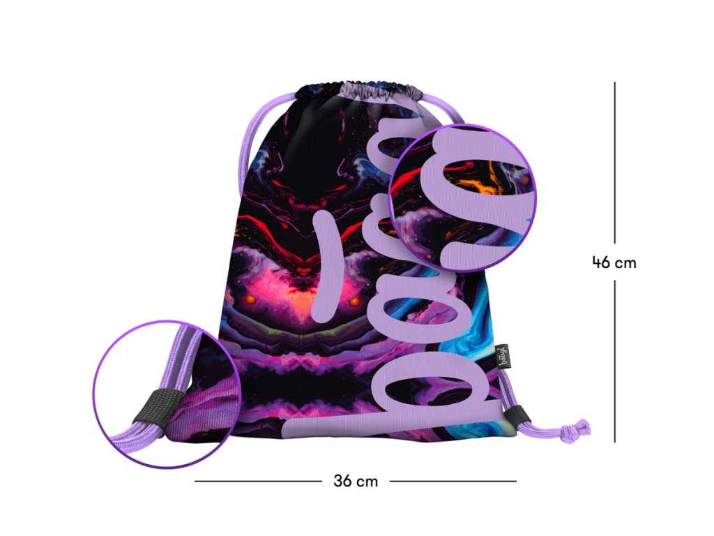 Univerzální sáček na obuv nebo drobnosti z pevného omyvatelného materiálu. Uzavírá se pomocí tkanic, které umožňují pohodlné nošení na zádech.
