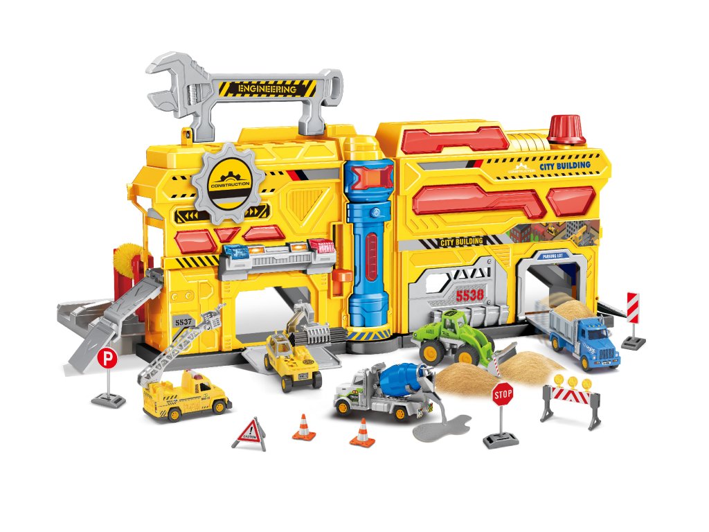 Stavební stanice přenosná. Rozměry 55x20x25 cm. Světelné a zvukové efekty. 3xAG13 baterie součástí. Součástí 2 auta s volnými koly, značky, nálepky. Obrázkový návod na sestavení součástí. Samolepky nalepte dle obrázků na obalu.