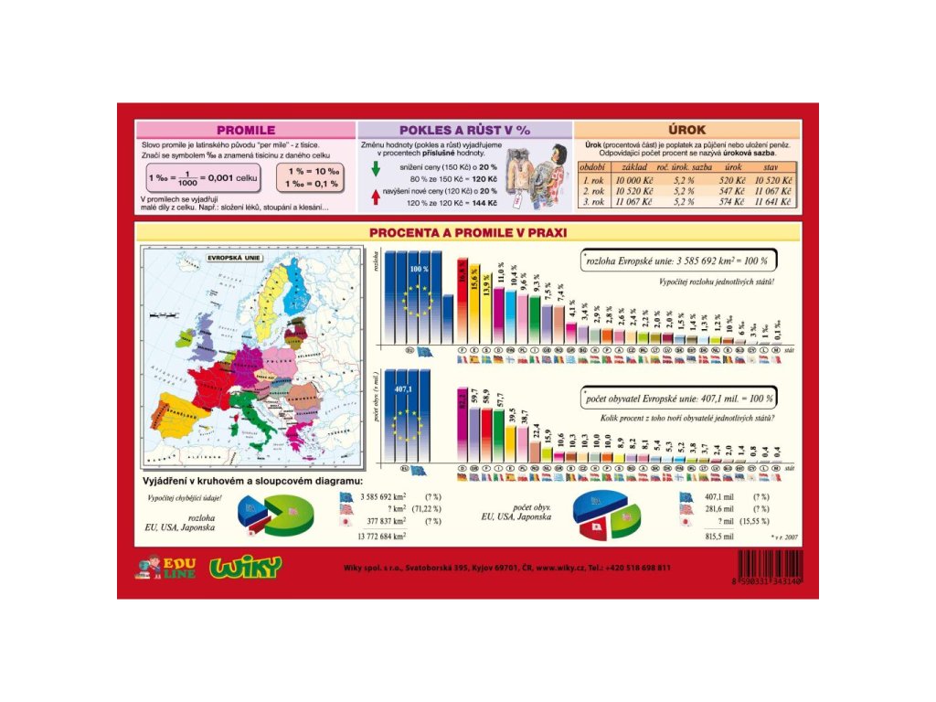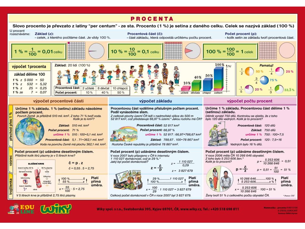 - Zadní stranu tvoří především grafické vyjádření procent s příklady na výpočet procentuální části a procent.